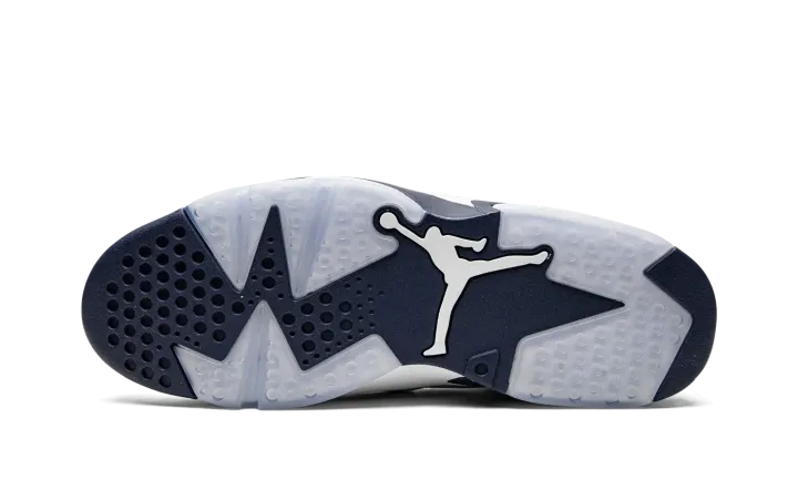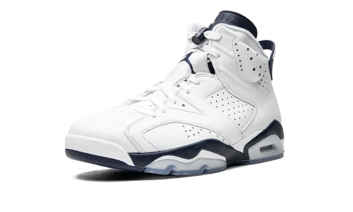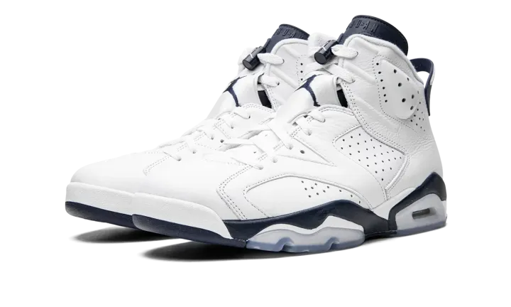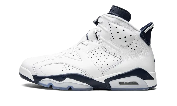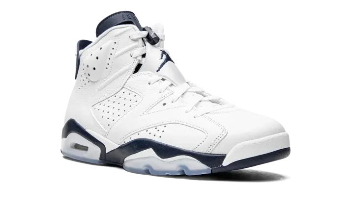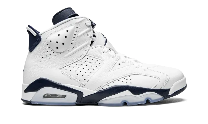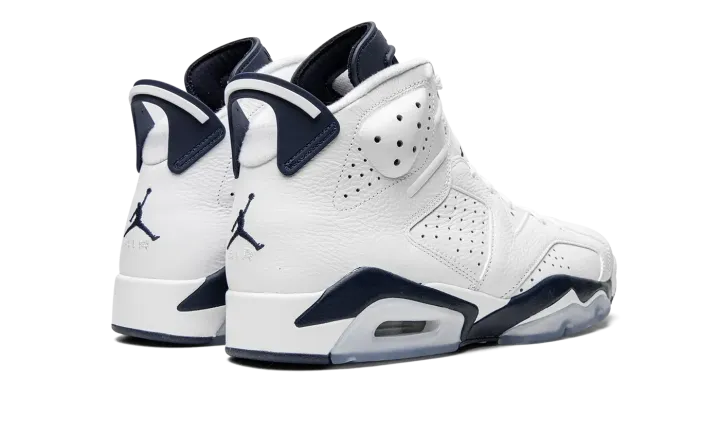 The Air Jordan 6 "Midnight Navy" is a non-original colorway of Michael Jordan's sixth signature shoe that originally debuted in 2000 and was brought back in early 2022. The "Midnight Navy" was once part of Jordan Brand's "Retro+" collection, a series of non-original colorways from the late '90s and early 2000s that put a new "lifestyle" spin on classic Air Jordan models, like the Air Jordan 6. Interestingly, the "Midnight Navy" colorway of the vintage basketball shoe is styled similarly to the model's "White Infrared," "Sport Blue," and original "Maroon" looks. The entire upper, including the perforated panels on the sides, the perforated collar, and overlays, appear in white tumbled leather. A Midnight Navy Jumpman is embroidered onto the white nylon lace overlay. Additional Midnight Navy accenting comes into play on the lace toggle with white Jumpman branding, on the tongue, and on the spoiler on the heel. A navy blue Jumpman is stitched onto the heel above white "Air" branding. Release date: March 2022