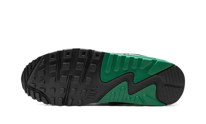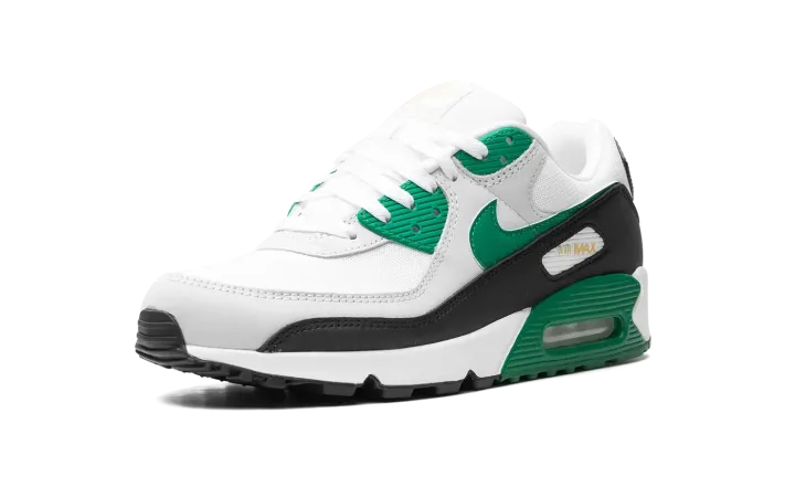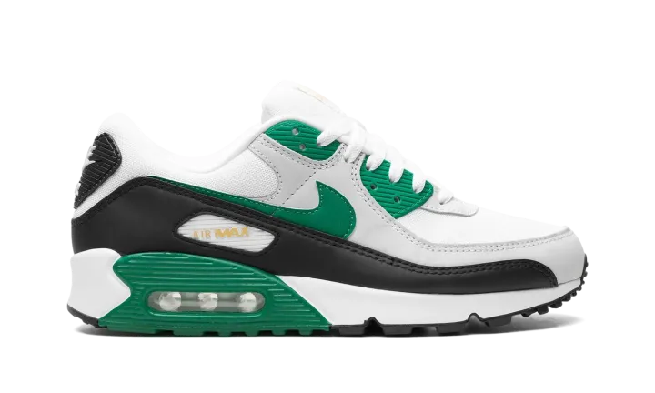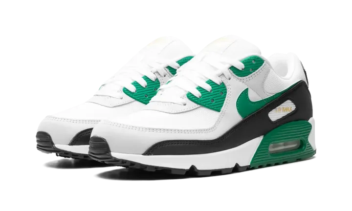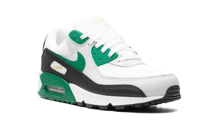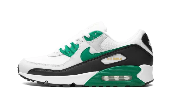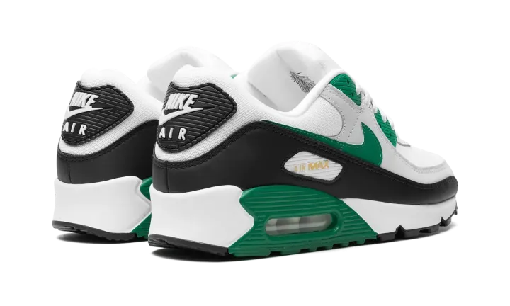 The Nike Air Max 90 "Malachite" is a colorway of the retro running shoe with green, black, and gold accents. The upper features a white mesh base layer contrasted with a light grey synthetic nubuck panel on the midfoot, and a black leather mudguard. A Malachite-colored Swoosh can be found on both sides of the shoe, while an "Air Max" branding window appears on the lateral side of the quarter panel, and classic "Nike Air" detailing is seen on the heel. Moreover, additional branding appears in the form of the "Air Max" detailing on the tongue tag. A Malachite panel surrounds the visible Air unit in the heel of the midsole. Release date: December 26, 2023