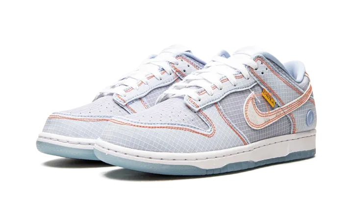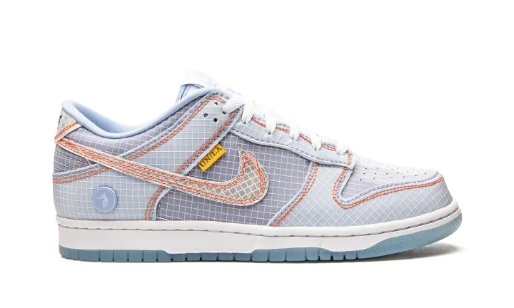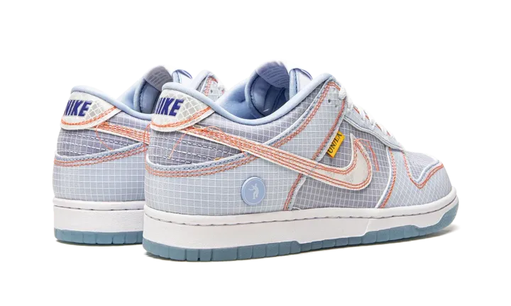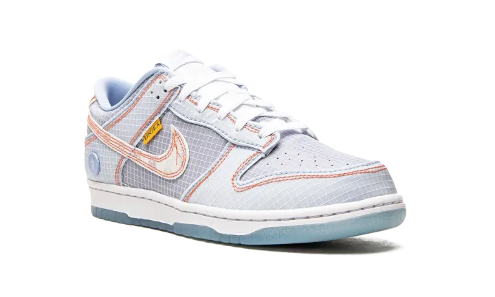 The Union x Nike Dunk Low "Hyper Royal" is a collaboration between Chris Gibbs's Los Angeles fashion boutique and Nike on the vintage basketball shoe. Perhaps best known for its Air Jordan collaborations since the 2010s, Union LA—or just Union for short—is a longtime partner of Nike, having worked with the brand in various instances dating back to the early 2000s. Here, the "Hyper Royal" is one of three colorways of the Dunk from Union's 2022 collaboration with Nike. The shoe features a gridded, ripstop-nylon-like material on its light blue upper. Each overlay is outlined in orange. A small yellow "UN/LA" hang tag appears on the lateral side of the midfoot overlay and the brand's "Halo" skateboarding logo is found on the heel and the forefoot of the outsole. The shoe features additional hang tags that allude to baggage claim tags. Underfoot, a white rubber midsole is paired with an icy, semi-translucent outsole.