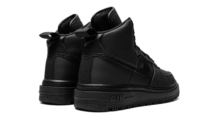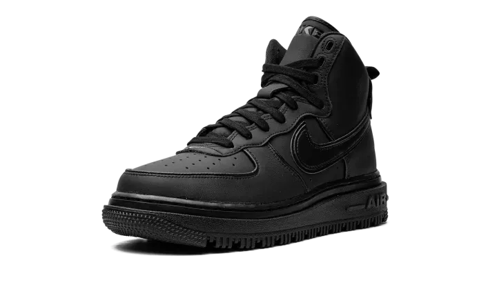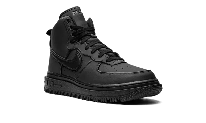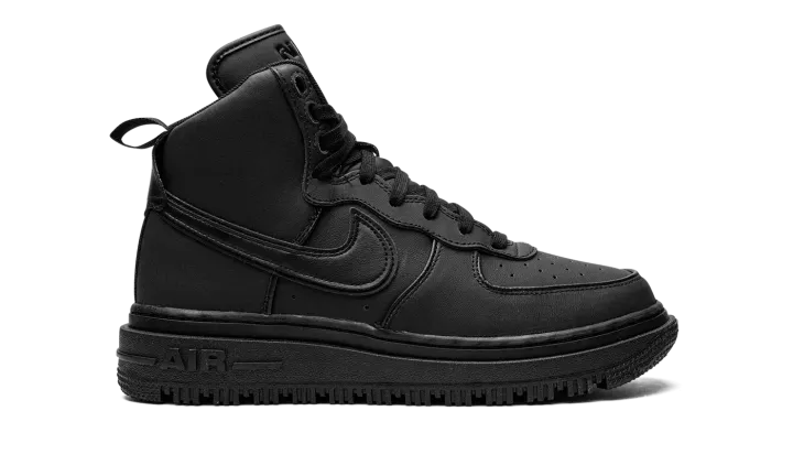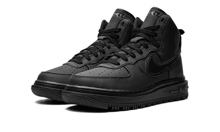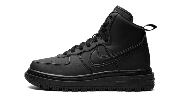The Nike Air Force 1 Boot "Black/Anthracite" is a rugged sneaker-boot hybrid that updates its design with rugged materials to withstand inclement weather conditions. The "Black/Anthracite" gives the Air Force 1 Boot a durable makeover that is resistant against tears, scuffs, and abrasions, making it an ideal option for the fall and winter months. The upper is constructed from a water-resistant black textile that keeps the wearer's foot dry. Underfoot, a black midsole with tonal "Air" branding and a lugged rubber outsole complete the formidable sneaker-boot.