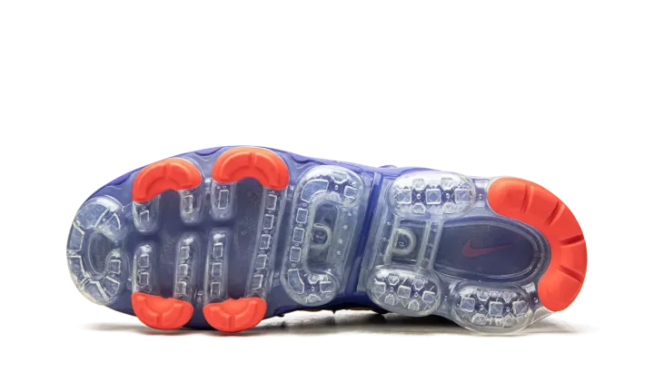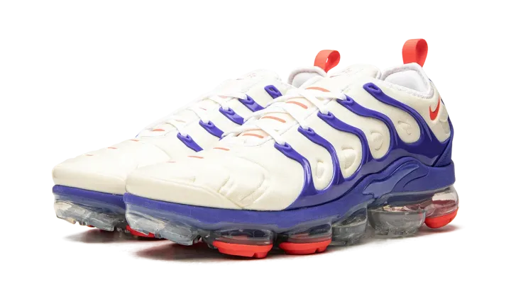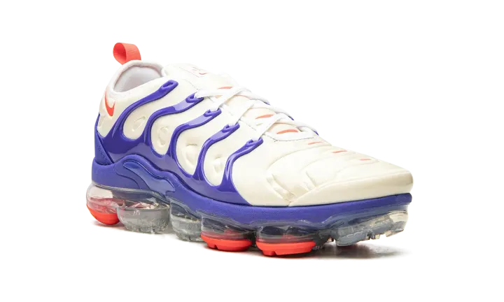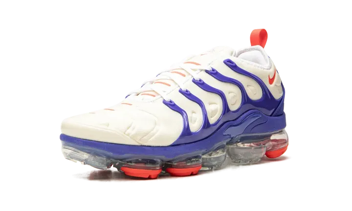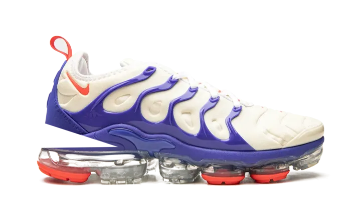 The Nike Air VaporMax Plus "Coconut Milk/Hyper Royal" is a red, white, and blue colorway of the futuristic lifestyle shoe that features design elements based on the classic Air Max Plus. The Air VaporMax Plus features Nike's revolutionary VaporMax technology underneath the shoe for a relaxed ride. The upper is constructed from a Coconut Milk-colored neoprene material and features glossy Hyper Royal TPU overlays on both sides that assists in supporting the lacing structure. A red Swoosh appears on the collar and the Air Max Plus' Tuned Air logo-inspired "Vm Air" emblem can be found on the heel. Tonal "Nike" insignia appears on the white tongue tag.