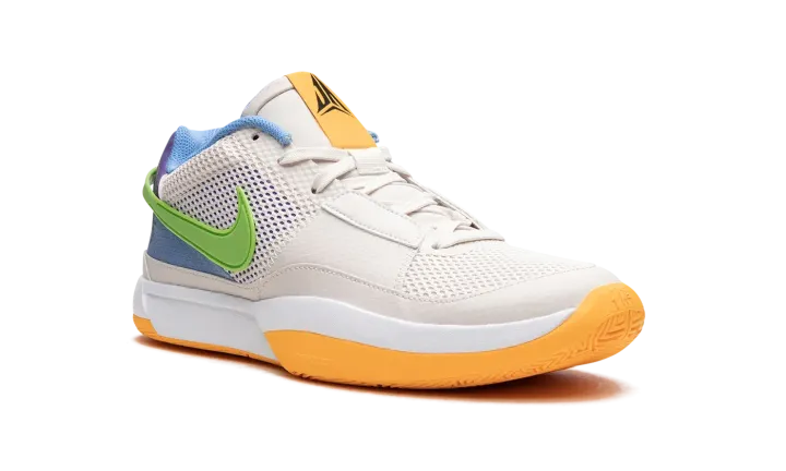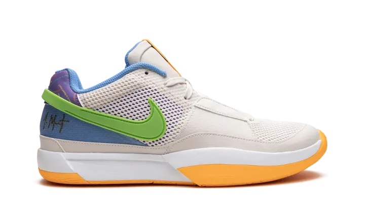 The Nike Ja 1 "Trivia" is an original colorway of Ja Morant's first signature shoe with Nike Basketball. Ja Morant, one of the most exciting and athletic players in the NBA, received his very own signature shoe with Nike Basketball in 2023. This "Trivia" or "Phantom" colorway is one of the model's most hyped releases, and one of its most versatile, too. The shoe is complete with a white mesh and leather upper with both materials appearing on various points on the design. An Action Green Swoosh is found on either side of the shoe. Ja's "12" jersey number with the Memphis Grizzlies appears on the heel. Questions inspired by Ja Morant's play on the court and personal life also reside on the back of the shoe and on the insole. Release date: April 27, 2023