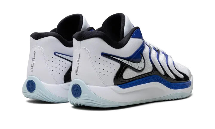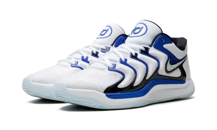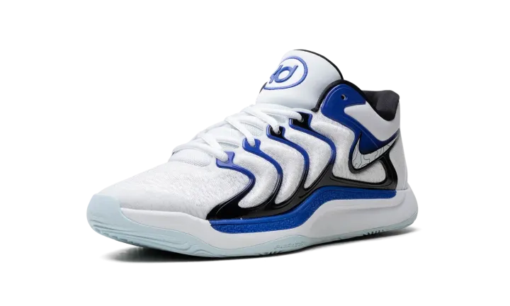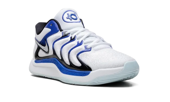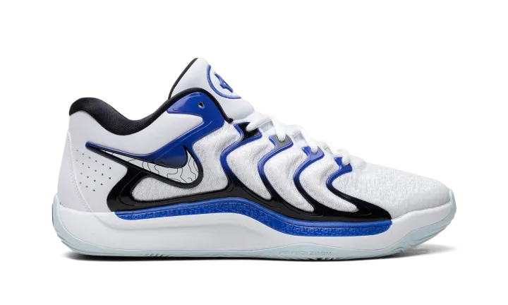 The Nike KD 17 "Penny" is a colorway of Kevin Durant's seventeenth signature shoe with Nike Basketball inspired by aesthetics from the Nike Air Penny line. Inspired by the colors of the Orlando Magic, the team that drafted Anfernee "Penny" Hardaway in the mid-90s, the "Penny" Nike KD 17 has a white, black, and royal color scheme. Moreover, the Nike KD 17's silhouette features wavy vertical lines that are reminiscent of the Nike Air Max Plus's thermoplastic "veins." The upper is complete with a knit textile construction and, as mentioned, wavy Game Royal TPU overlays. The curvy black lines in the white Swoosh are a nod to the design of the Swoosh logo found on early Nike Air Penny models. Durant's signature branding appears on the tongue. An Air Zoom cushioned outsole provides comfort on or off the court. Release date: May 24, 2024
