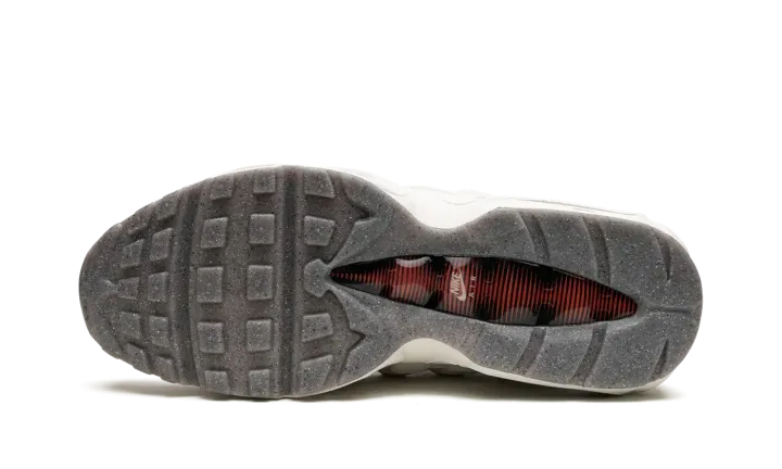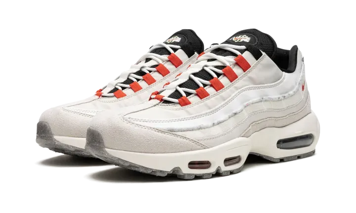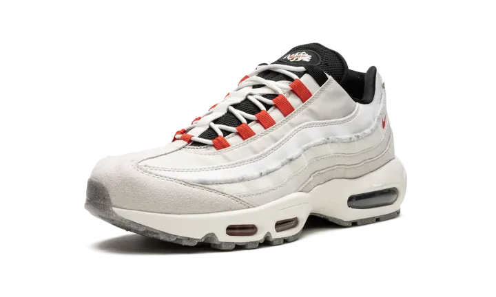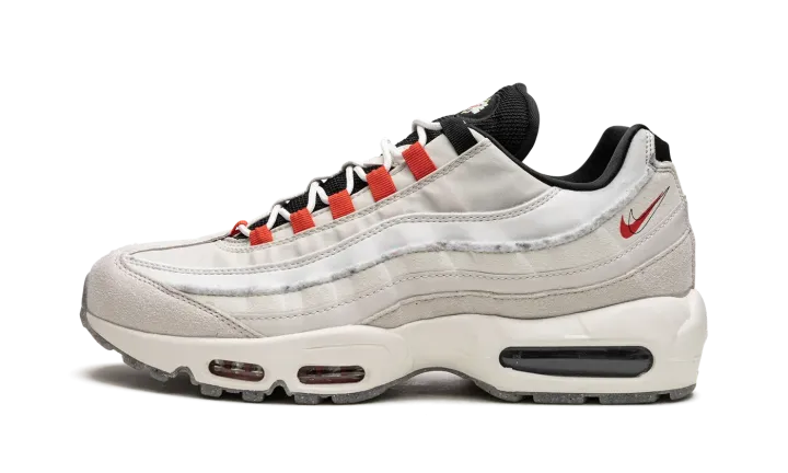 The Nike Air Max 95 SE "Double Swoosh" is a colorway of the vintage performance running shoe with layered Swooshes on its collar. The Air Max 95's legacy continues on the "Double Swoosh" colorway, a unique release from Nike's Spring 2023 line. Design wise, the shoe features white and light grey textile panels that resemble the sternum of an anatomical ribcage. Stacked black outline and red Swooshes appear on the collar. A "95" logo can be found on the heel and an updated "Air Max 95" graphic is found on the tongue. The white foam midsole features red-tinted Air bubbles in the forefoot and a smoky Air bubble in the heel. Release date: August 11, 2022