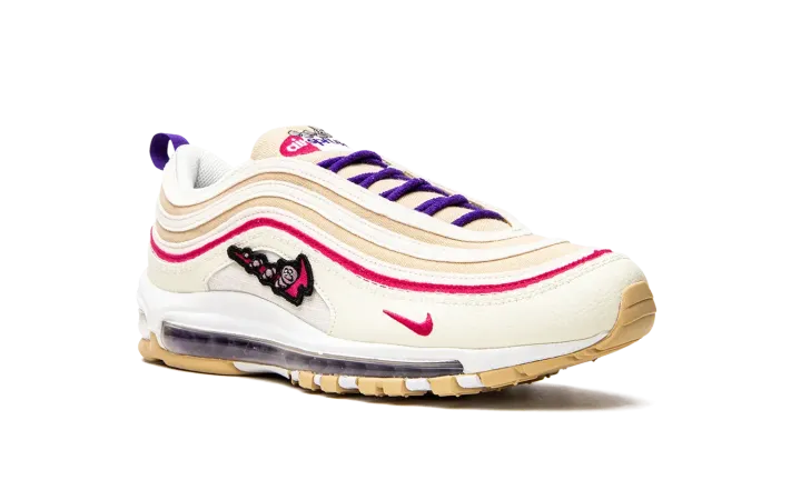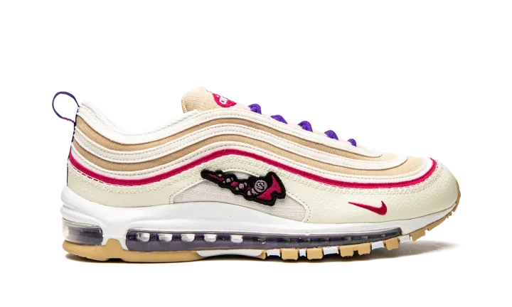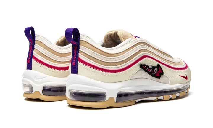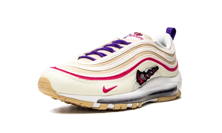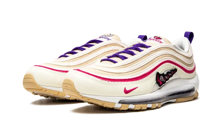 The Nike Air Max 97 "Air Sprung" is a festive colorway of the retro running shoe that hones in on a "rebirth" theme. From the "Air Sprung" pack from February 2022, this vibrant colorway is yet another example of Nike's efforts in sustainability, as the shoe's caterpillar designs are a tongue-in-cheek reference to recycled materials that began their lifecycle as one product, before becoming another later on. The shoe features a Coconut Milk-colored mudguard that is contrasted with Sesame and red wavy panels. A smiling caterpillar can be found hanging out on the embroidered Swoosh on the lateral side of the shoe. Additional characters, including a butterfly and mushroom, appear on the tongue and insole, respectively. Custom "Air Sprung" branding is found on the tongue. Release date: February 1, 2022