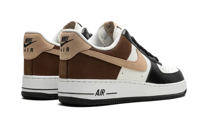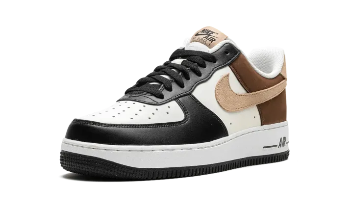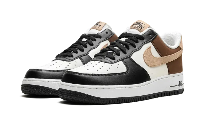 The Nike Air Force 1 Low "Mocha" is a colorway of the retro basketball shoe with the coffee-inspired shade of brown on its design. The Air Force 1 Low "Mocha" is complete with Summit White leather on the perforated toe and mid-panel, and Black leather on the toe cap, forefoot, and eyelets. A coffee-inspired shade of Mocha leather can be seen on the quarter panel and heel. A tan suede Swoosh appears on either side of the shoe, and classic "Nike Air" and "Nike Air Force 1" branding are located on the heel and tongue tag, respectively. A white midsole with "Air" branding on the lateral side completes the look.