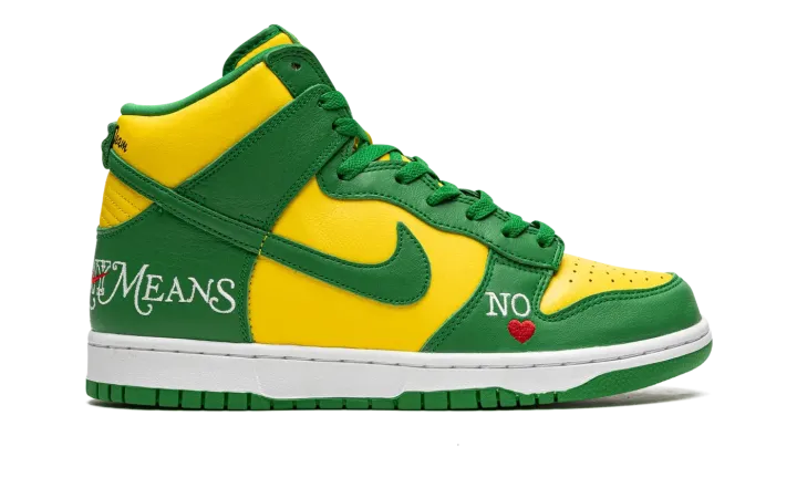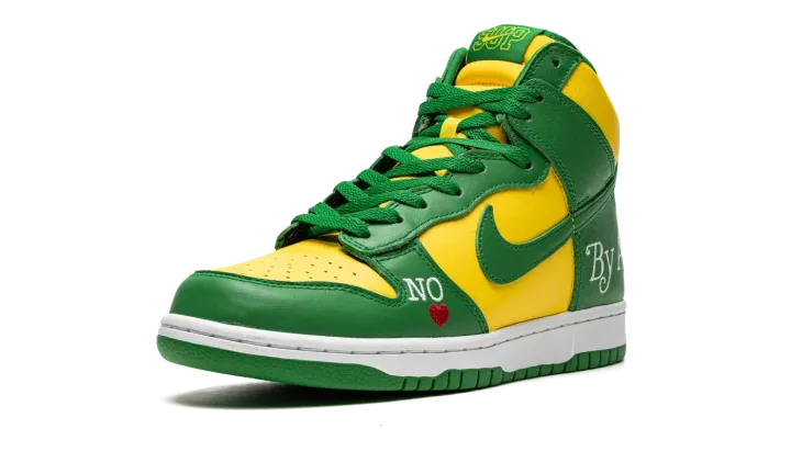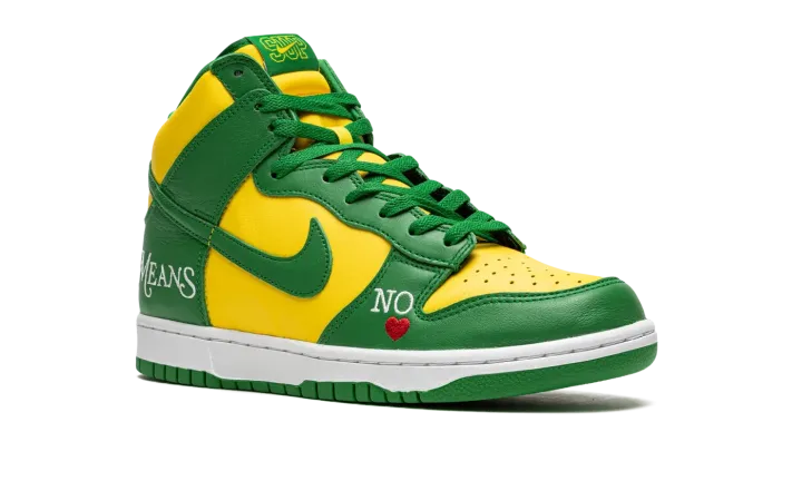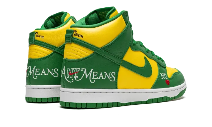 The Supreme x Nike SB Dunk High Pro "By Any Means - Green/Yellow" is a collaboration between the "World Famous" streetwear brand and Nike SB on the popular skate shoe. This instance in the collaboration between Supreme and Nike SB revives Supreme's "By Any Means" branding that originated on a remixed version of the New Era New York Yankees Fitted Hat issued by Supreme in the 2000s. The branding in question is the New York Magazine-style "By Any Means" font on the heel. Eye-catching yellow leather appears on the perforated toe, mid-panel, collar, and heel. The look is contrasted with green leather overlays and Swoosh branding. The two-tone, yellow-and-green color block is culled from the original Nike Dunk Low "Brazil" from 2001. The phrase "No <3," as in, "no love," appears on the forefoot and NWA-style "Supreme Team" detailing is found on the back of the collar. Moreover, '90s-esque "Sup" detailing joins an embroidered Swoosh on the tongue tag.