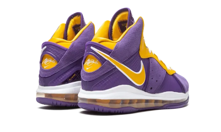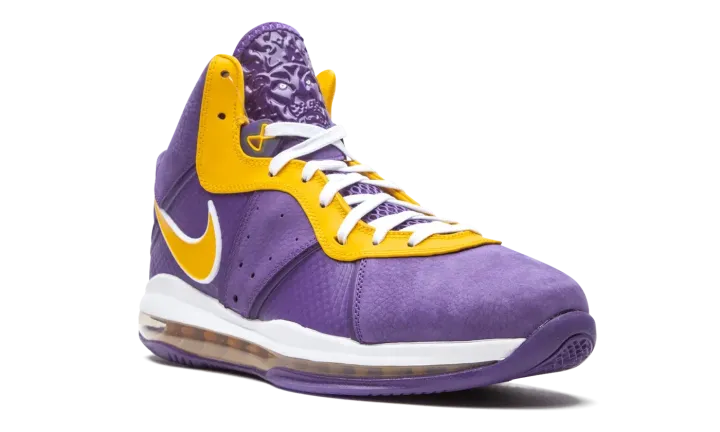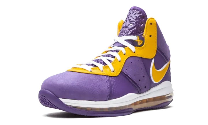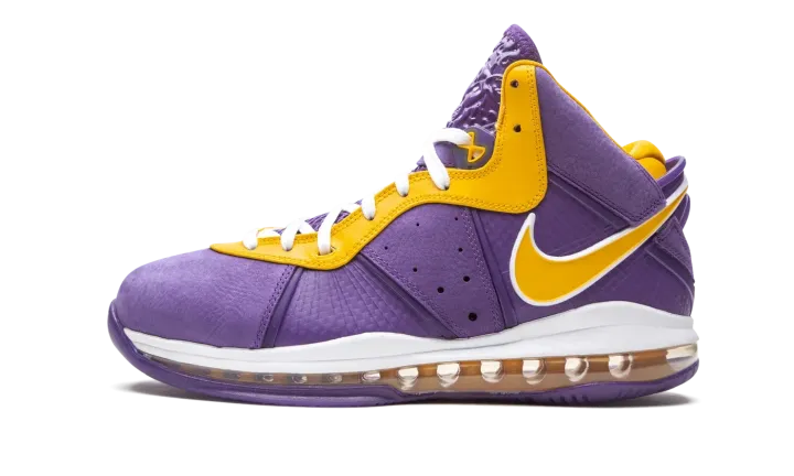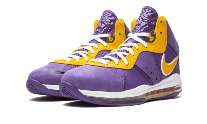 The Nike LeBron 8 "Lakers" is a Holiday 2020 release by Nike Basketball of LeBron James' eighth signature shoe in a colorway that salutes the basketball superstar's time with the Los Angeles Lakers. Debuting in 2011, the Nike LeBron 8 is perhaps the most beloved silhouette in the Nike LeBron line thanks to colorways like the "South Beach" and this "Lakers" inspired look. Buttery Court Purple colored suede and leather panels appear on the upper of this performance hoops model. University Gold accents on the leather eyelet panel, collar, liner, and Swoosh detailing complement the design. A mini black metallic Swoosh appears on the toe and LeBron's signature lion motif adorns the purple synthetic tongue. Underfoot, a full-length visible Max Air cushioning unit provides a responsive ride. Release date: December 15, 2020.