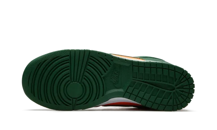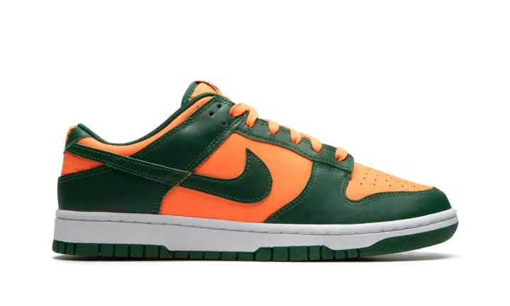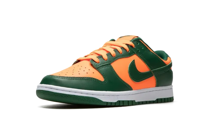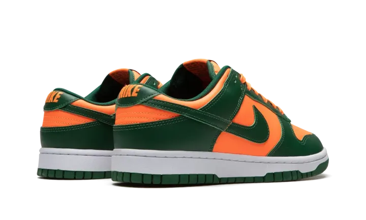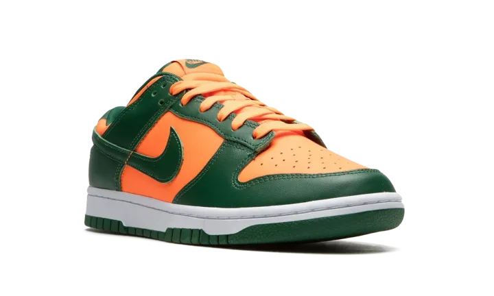 The Nike Dunk Low "Miami Hurricanes" is a colorway of the classic sneaker that is an unofficial nod to the team uniform colors of the Miami Hurricanes college basketball team. The perforated toe, mid-panel, collar, and heel all appear in orange leather. Contrasting Team Green leather is found on the overlays and Swoosh. Fiery orange "Nike" detailing is embroidered on the heel and green "Nike" and Swoosh logos appear on the orange nylon tongue tag on the tonal nylon tongue. A white midsole and Team Green rubber outsole complete the look. Release date: November 1, 2022
