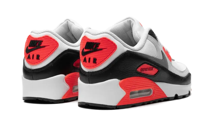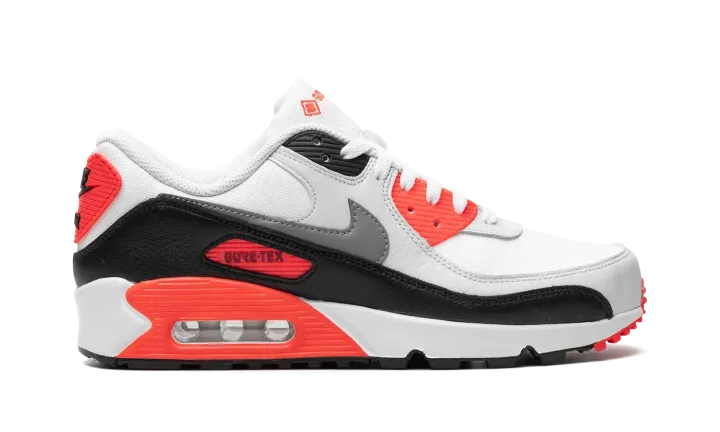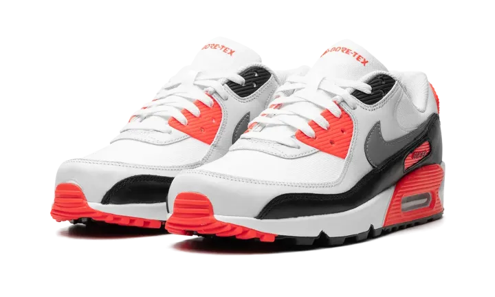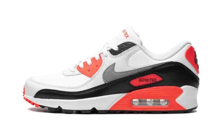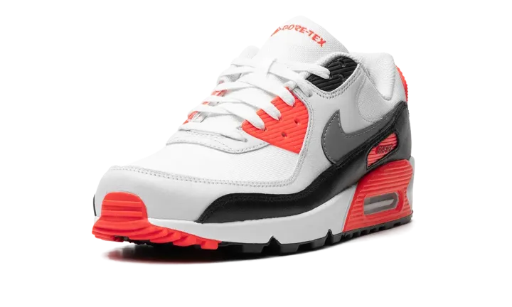 The Nike Air Max 90 Gore-Tex "Infrared" is an alternate version of the original colorway of the retro running shoe with a water-resistant construction. Made for inclement weather conditions, the Air Max 90 Gore-Tex in "Infrared" features a white mesh base with grey leather overlays and a black leather mudguard. A dark grey leather Swoosh appears on both sides, while "Nike Air" branding can be found on the heel counter. Underfoot, an Infrared panel surrounds the visible Air unit in the heel of the midsole. Release date: January 11, 2024