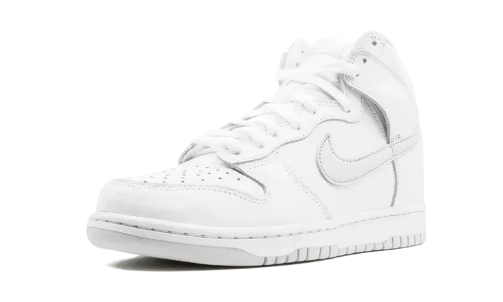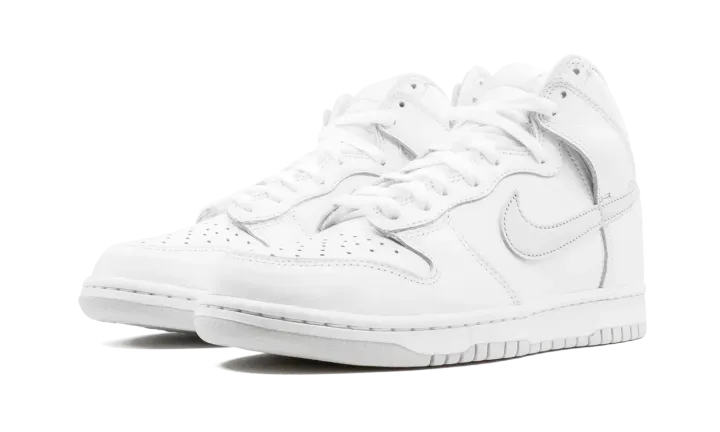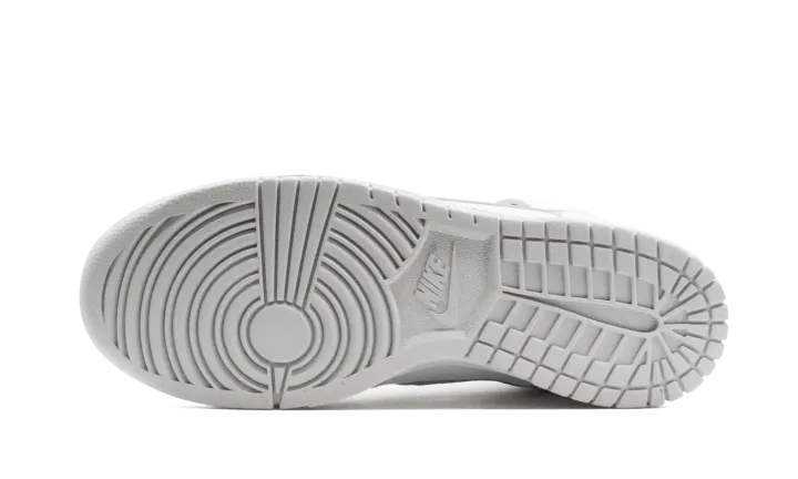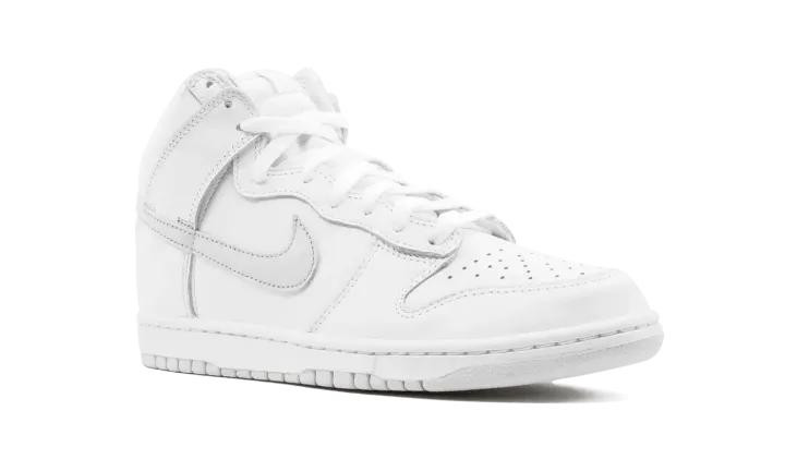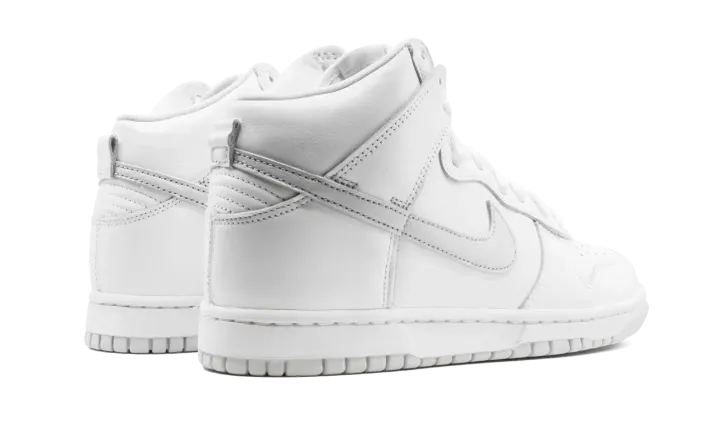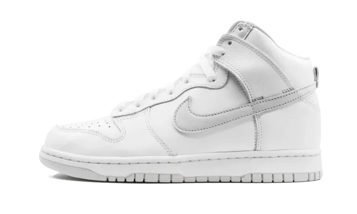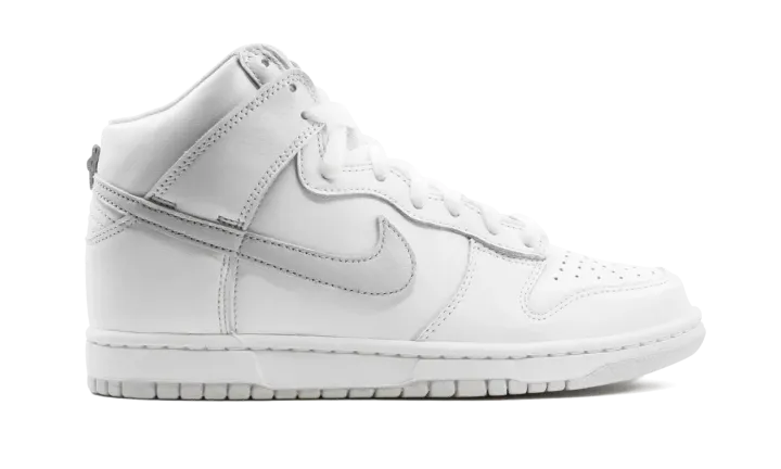 The Nike Dunk High SP "Pure Platinum" is a Fall 2020 release of the popular high-top silhouette in a neutral based colorway. The highly versatile "Pure Platinum" makeup has been deployed on classic Nike and Jordan models over the years, and its placement on the Dunk produces a favorable aesthetic for those who enjoy wearing a simple but refined shoe on a daily basis. The upper features white leather detailing on the perforated toe, mid-panel, collar, and heel. A subtle contrasting Pure Platinum Swoosh appears on either side of the shoe. Other details include white laces on a tonal leather tongue, a thickly padded ankle collar for support, and a light grey outsole that contrasts the white rubber midsole. Release date: November 13, 2020.