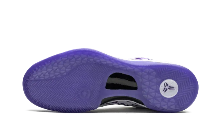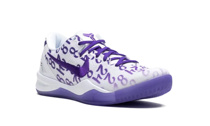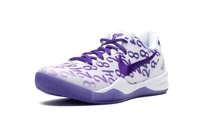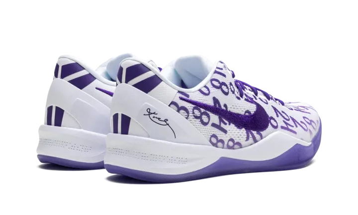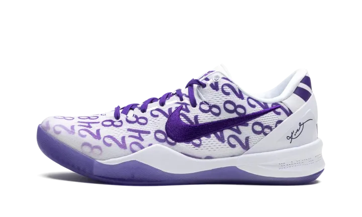 The Nike Kobe 8 Protro "Court Purple" is a colorway of Kobe Bryant's eighth signature shoe with Nike Basketball with Bryant's former "8" and "24" jersey numbers with the Los Angeles Lakers on its design. The upper features a white engineered mesh construction that features Bryant's "8" and "24" jersey numbers with the Lakers in purple in an all-over pattern. More purple accenting can be seen on the Swoosh, inner lining, and laces. The green hue also appears on Bryant's signature branding on the tongue and on the outsole underneath the white midsole. Release date: February 8, 2024