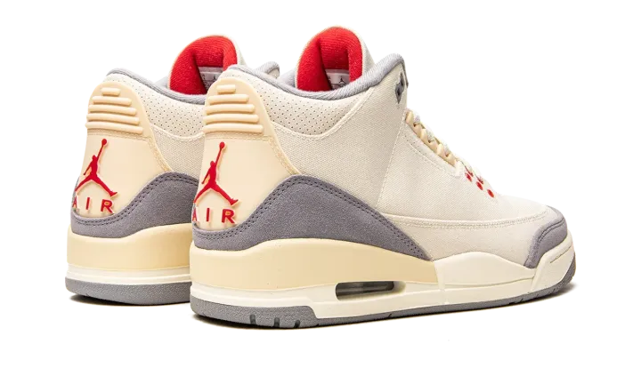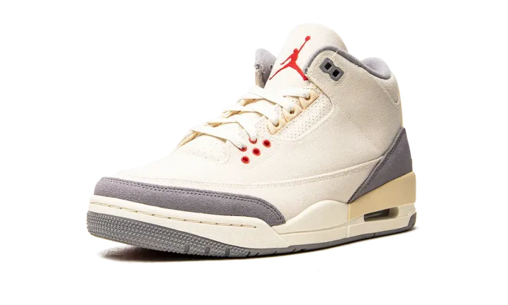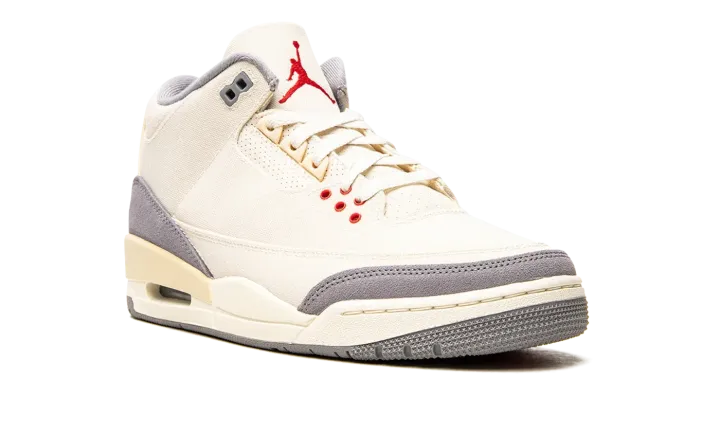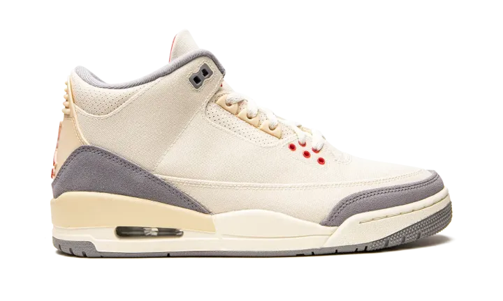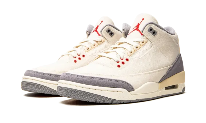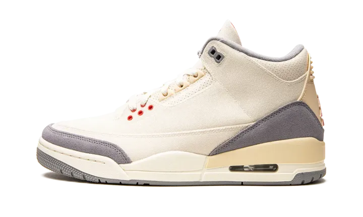 The Air Jordan 3 "Muslin" is a March 2022 release of Michael Jordan's third signature shoe in a colorway that modifies the silhouette's original design in a more streamlined appearance. The "Muslin" is a versatile look for the vintage basketball shoe that features a Sail-colored canvas upper with contrasting grey suede panels on the toe and heel that replace the Jordan 3's original elephant print design. A darker shade of cream white is found on the eyelets, heel tab, and midsole. Jordan Brand places a red Jumpman on the tongue and on the heel beneath the "Air" branding. Release date: March 25, 2022