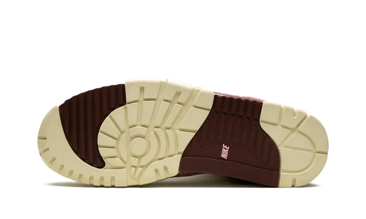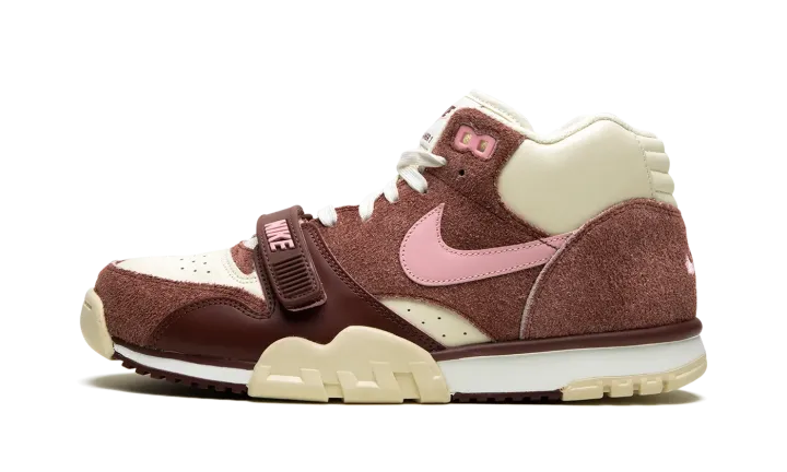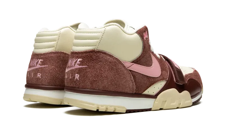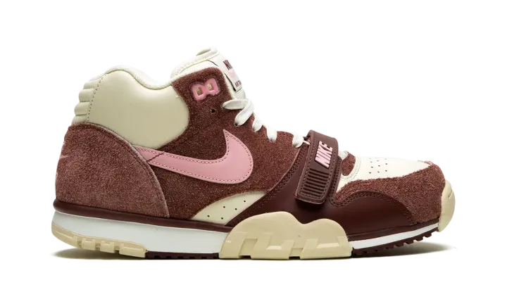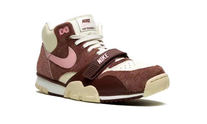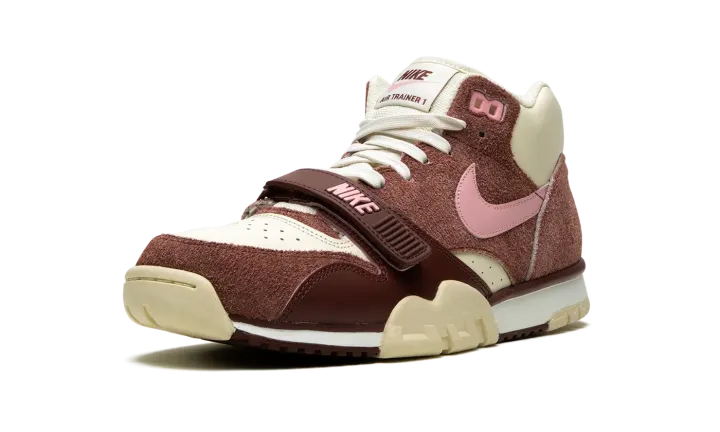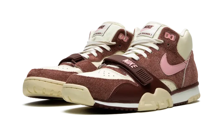 The Nike Air Trainer 1 "Valentine's Day" is a colorway of the retro cross-training shoe that is inspired by the February holiday and the chocolate candy associated with its festivities. As festive a colorway as there is for the Air Trainer 1, the "Valentine's Day" features shaggy brown suede overlay panels as a nod to chocolate candies that are often consumed around the holiday. A creamy white leather base and a pink leather Swoosh add to the look. Classic "Nike Air" branding is embroidered on the heel and pink "Nike" logo detailing is found on the adjustable brown midfoot strap.
