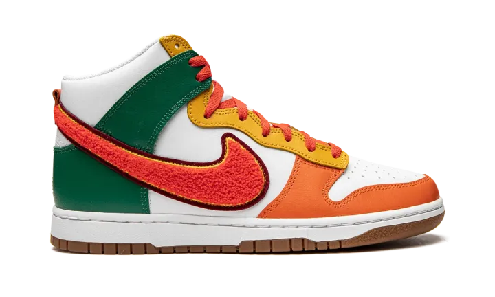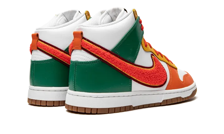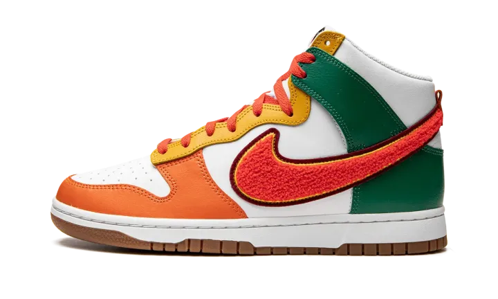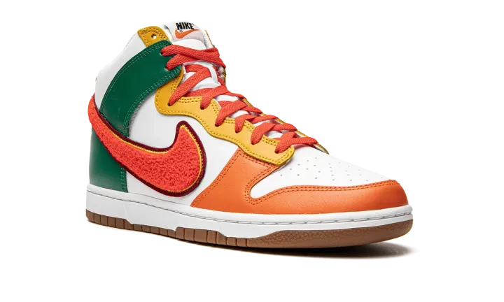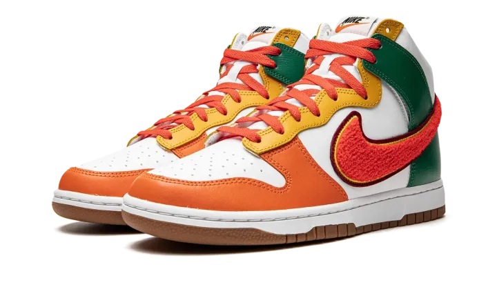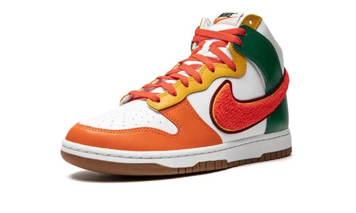 The Nike Dunk High University "Habanero Red" is a colorway from the "University" collection that puts a collegiate-inspired spin on the retro basketball shoe. The "Habanero Red" Dunk High University modifies the shoe's design in a big way with mismatched leather panels and unique Swoosh branding. The base of the upper is designed in white leather. Both the toe cap and forefoot feature an orange leather overlay. The collar and heel have a green leather overlay. An oversized Habanero Red chenille Swoosh appears on either side of the shoe. "Nike" and Swoosh branding on the tongue tag completes the look. Release date: August 31, 2022