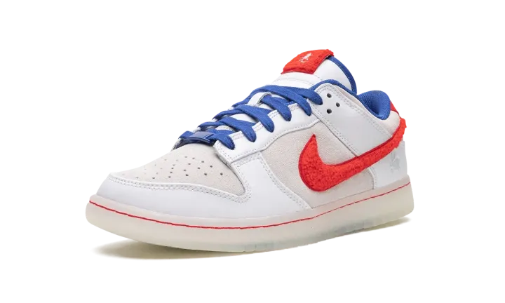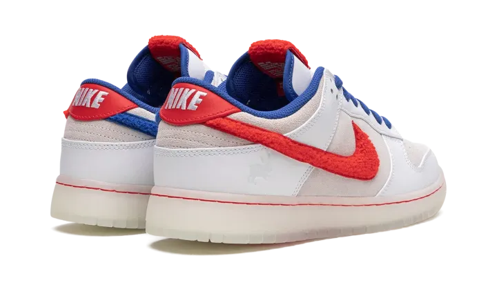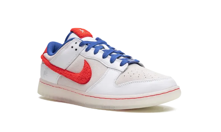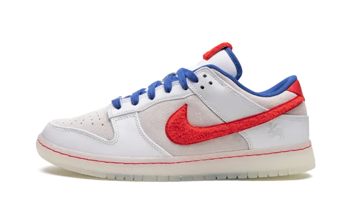 The Nike Dunk Low "Year of the Rabbit" is a colorway of the vintage basketball shoe that is inspired by a traditional milk-cream-flavored candy that is popular in China. Celebrating Chinese New Year 2023, the "Year of the Rabbit" Dunk Low is also inspired by the zodiac animal. The shoe's white, red, and blue color scheme nods to the wrapper of the aforementioned candy. More specifically, the shoe features a Sail suede base with contrasting white leather overlays. A red chenille Swoosh appears on the sides and a red chenille tongue tag is found on the tongue. A small debossed rabbit detail is found on the lateral side of the heel. Underfoot, an opaque sole completes the look.
