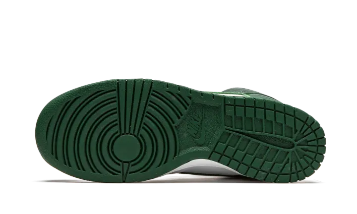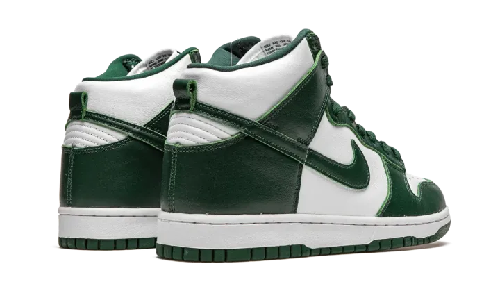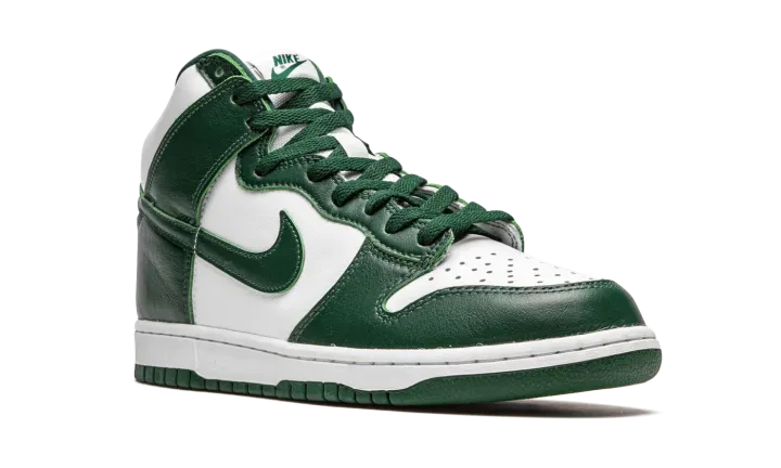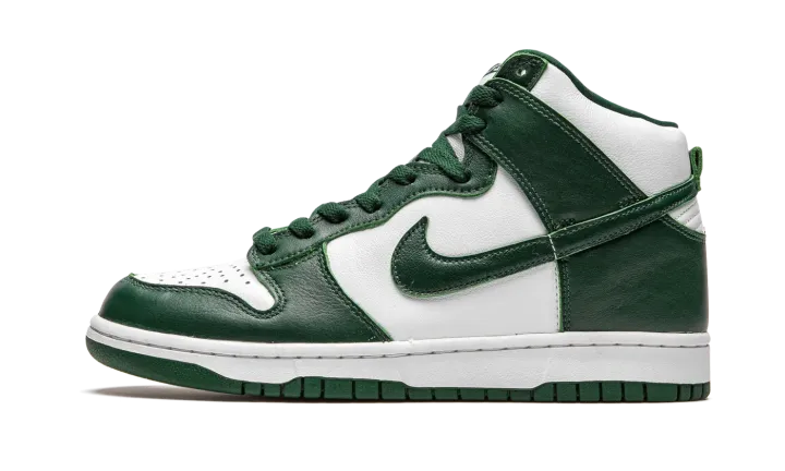 The Nike Dunk High "Spartan Green" employs the team uniform colors of the Michigan State Spartans on the ever-popular Dunk silhouette. This Fall 2020 release is a sequel to the "Spartan Green" colorway that was originally released on the Nike Dunk Low in 2008. Also inspired by the "Be True to Your School Pack" from 1985, this "Spartan Green" color scheme on the high-top Dunk is undoubtedly a classic design. Details include a white leather base that is visible on the perforated toe, mid-panel, and collar. Rich Pro Green leather overlays can be found on the forefoot, eyelets, collar, and heel. The white nylon tongue features green "Nike" insignia. Additional branding appears in the form of a green leather Swoosh hit on the sides of the shoe. A white rubber midsole and green outsole put the finishing touches on one of the top Dunk colorways of 2020. Release date: September 18, 2020.