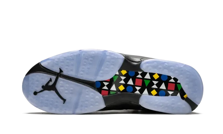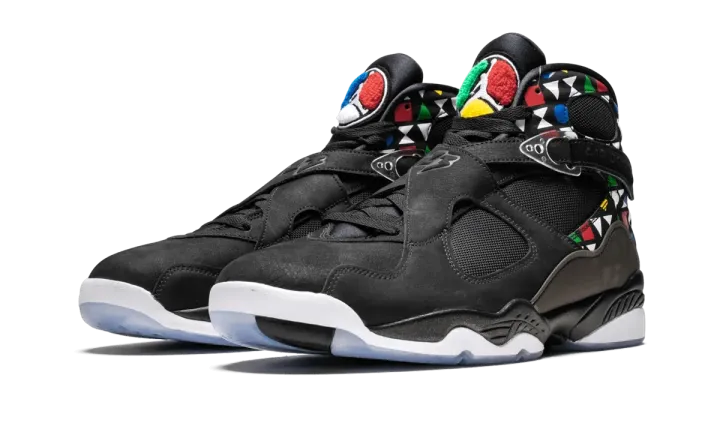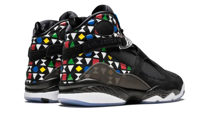 The Air Jordan 8 "Quai 54" is a special edition of the classic Michael Jordan signature shoe that released for the 2019 Quai 54 streetball tournament. Jordan Brand has made producing special releases for the annual hoops tournament in Paris, France a tradition in recent years, and 2019's set was one of the most unique and colorful yet. The collection was highlighted by this Jordan 8 featuring a multicolor geometric print, which was utilized across the set of sneakers and apparel for Quai 54. The construction features a ballistic nylon and nubuck upper in solid black with the colorful print on the heel and ankle paneling. Additional special details include clear buckles on the straps, and a translucent black plastic mudguard. Icy clear rubber and another hit of the pattern on the outsole complete the design. The Air Jordan 8 "Quai 54" released in limited quantities on June 8, 2019.