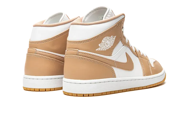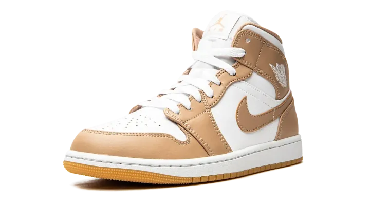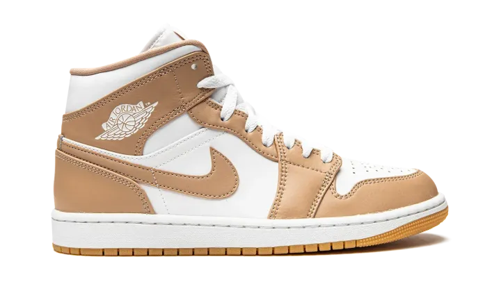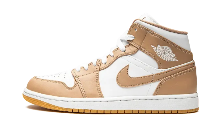 The Air Jordan 1 Mid "Tan/Gum" is a two-tone, white-and-tan colorway of the popular mid-top version of the retro basketball shoe. The Fall 2021 "Tan/Gum" edition of the Jordan 1 Mid excels in wearability with a clean and casual color block featuring white leather on the perforated toe, mid-panel, and collar. The forefoot, eyelets, collar, and Swoosh are displayed in tan-colored leather. A white Wings logo appears on the collar and a tan Jumpman and Air branding can be found on the white nylon tongue. Underfoot, the white rubber midsole is contrasted by a gum-colored outsole for a timeless look.