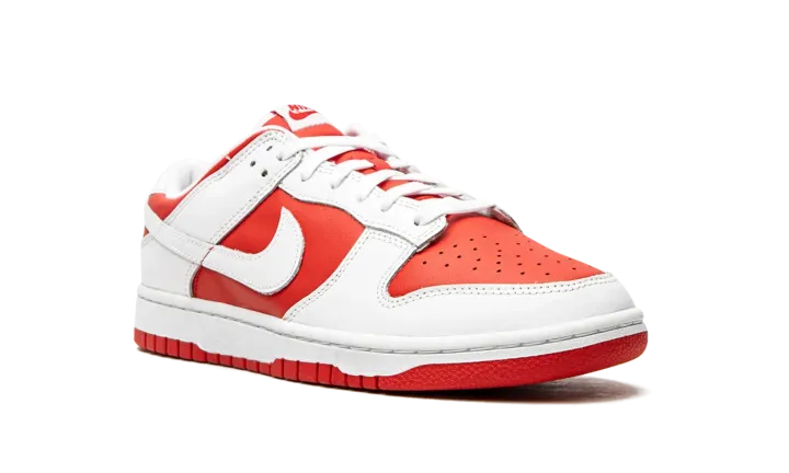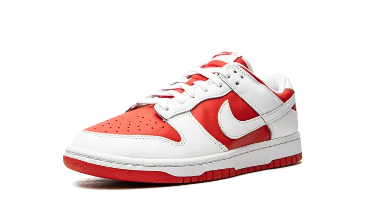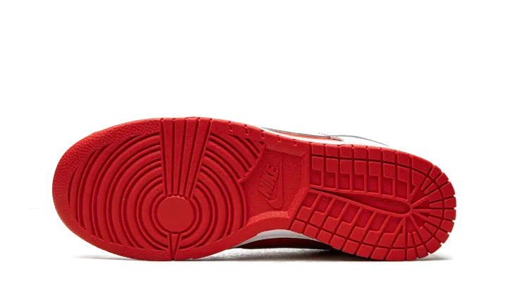 The Nike Dunk Low "University Red" reverses the color block of the vintage basketball shoe's original "St. John's" colorway that was part of the "Be True to Your School" collection from 1985. A September 2021 release, the modern "University Red" Dunk draws from the colorway of the same nickname that was part of the aforementioned college basketball-inspired line from the mid-80s. The perforated toe, mid-panel, collar, and heel display a bold University Red leather construction. White leather on the overlaid panels and Swoosh contrast the look. Red "Nike" detailing is embroidered onto the heel and a red "Nike" with a Swoosh logo appears on the white nylon tongue tag on the red nylon tongue. White laces cover the red tongue and a white midsole and University Red rubber outsole complete the look. Release date: September 16, 2021