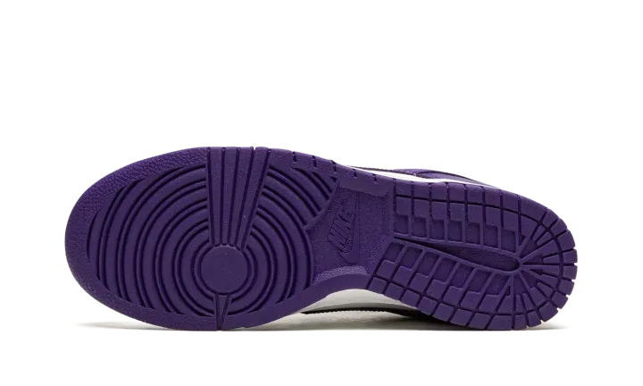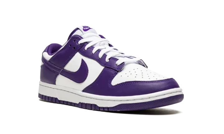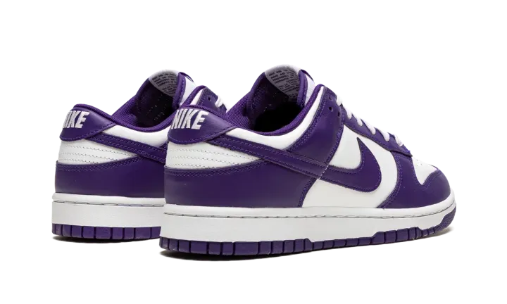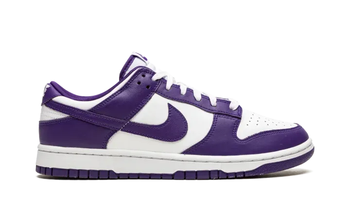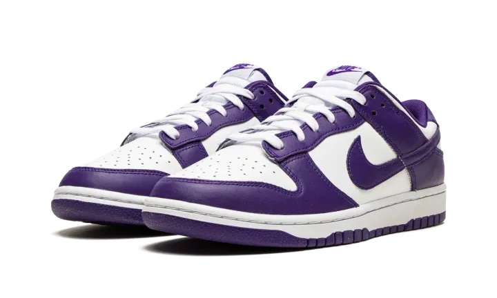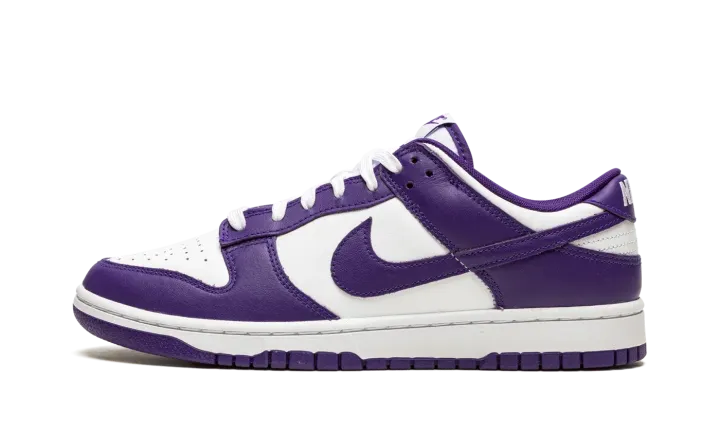 The Nike Dunk Low "Court Purple" is a two-tone, white-and-purple colorway of the retro basketball shoe that was released in 2022. The "Court Purple" Dunk Low features a white leather base with contrasting Court Purple overlays and Swoosh branding. White "Nike" branding is embroidered on the heel and Court Purple "Nike" and Swoosh detailing are printed on the white nylon tongue tag on the white nylon tongue. A two-tone, white midsole and Court Purple rubber outsole completes the look.
