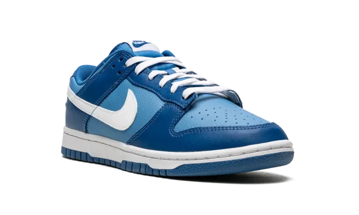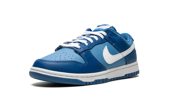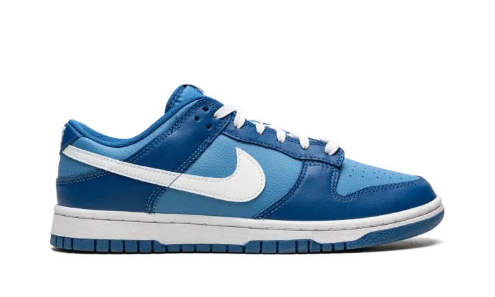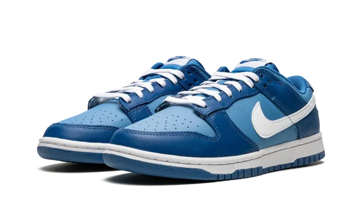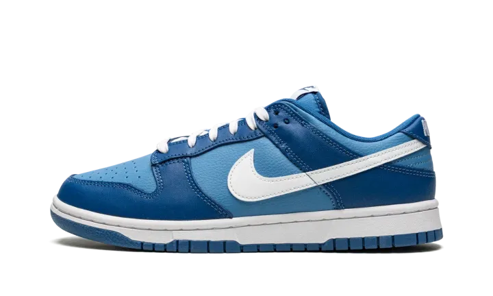 The Nike Dunk Low "Dark Marina Blue" is a two-tone, white-and-blue colorway of the popular lifestyle shoe that was released in early 2022. Inspiration for the "Dark Marina Blue" comes from none other than the Dunk Low "Argon" from 2001, as the former features the same dark and light blue leather panels, but in reverse order. The toe cap, forefoot, eyelets, collar, and heel are designed in Dark Marina Blue leather. The base appears in light blue leather. A white leather Swoosh is found on either side of the shoe and white "Nike" branding is embroidered on the heel. The white nylon tongue tag features blue "Nike" and Swoosh detailing. Underfoot, a white midsole and blue rubber outsole put the finishing touches on the look.