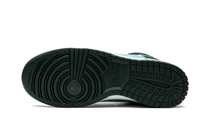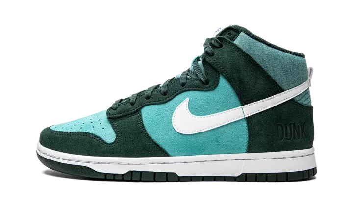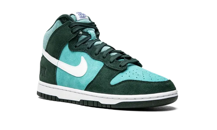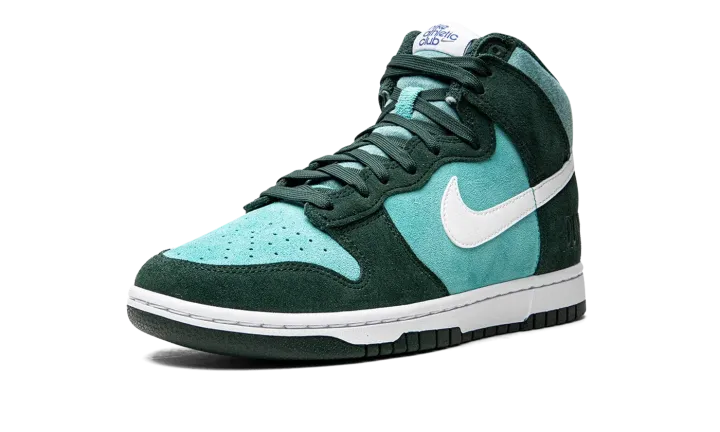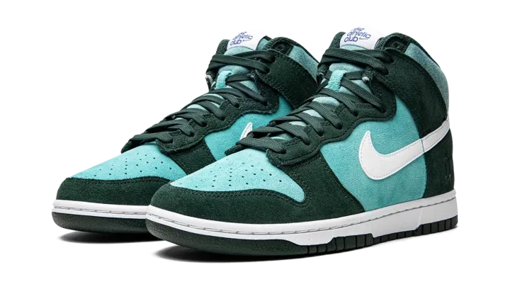 The Nike Dunk High "Athletic Club - Pro Green" is a colorway of the retro basketball shoe from the collection inspired by the "Athletics West" running club formed by Phil Knight, Bill Bowerman, and Geoff Hollister in 1977. The "Pro Green" Dunk High colorway from the "Athletic Club" series features a Washed Teal suede construction with Pro Green suede overlays. A white leather Swoosh is found on the side. A "DUNK" logo in block lettering appears on the heel and an "Athletic Club" logo can be found on the tongue tag. The inner lining is finished with a fuzzy terry cloth fabric. Release date: June 18, 2023