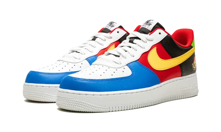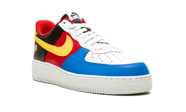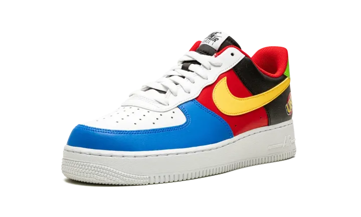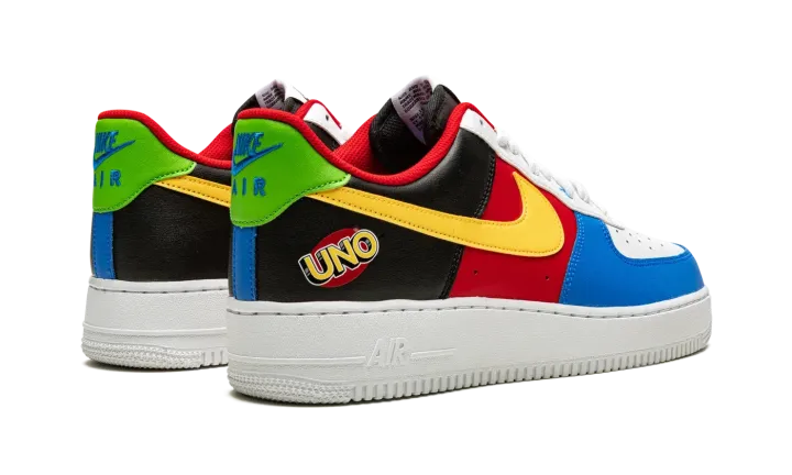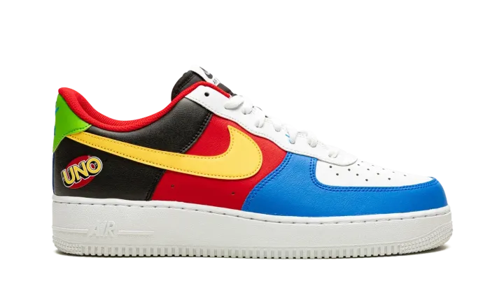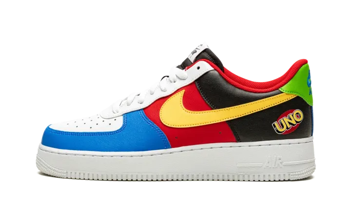 The Nike Air Force 1 Low "Uno" brings a classic card game into sneaker form. This sneaker arrives in a multi-color palette, in the hues you'd typically find within the UNO card game. White leather covers the perforated toe box and eyestay placket, contrasted by blue around the toe, red on the mid-panel, and black on the rear-quarters and heels. More hits of blue are found on the heel stripe and "Nike Air" branding, paired with vivid green on the heel tab. UNO's logo graces the lateral-side heel, appearing alongside a yellow Swoosh.