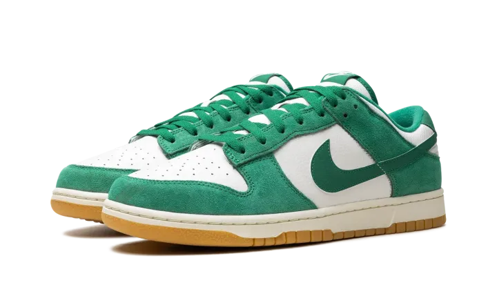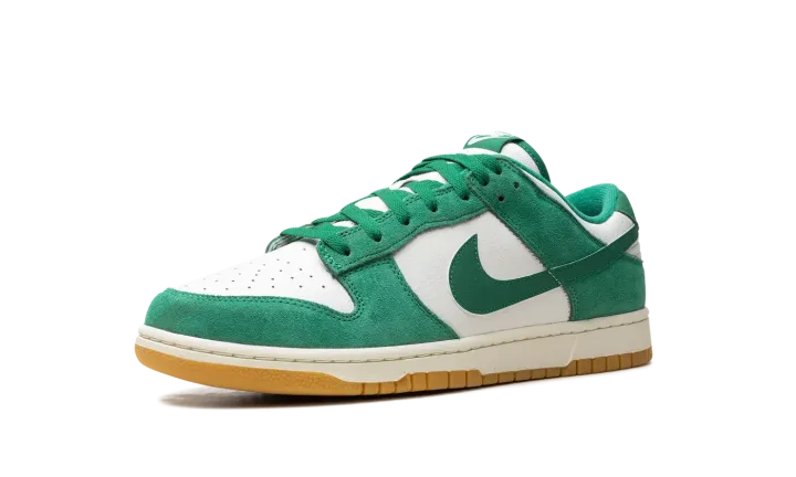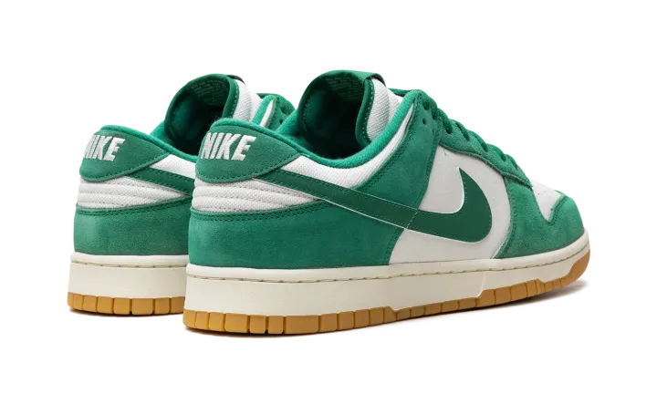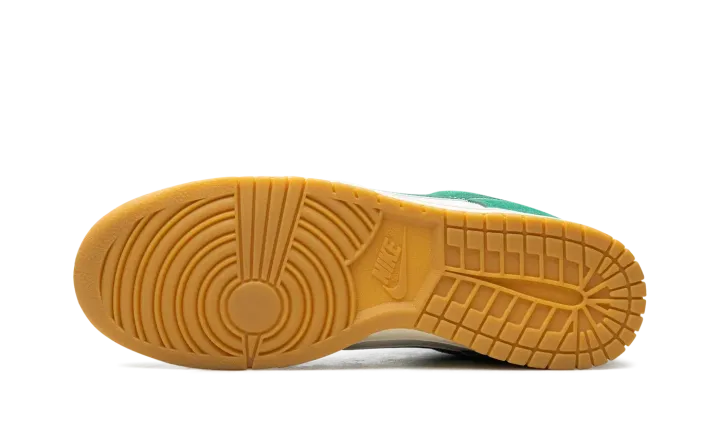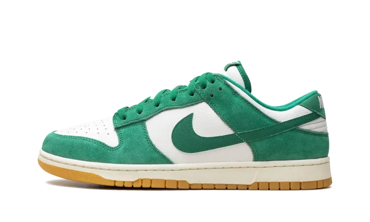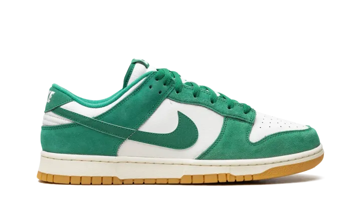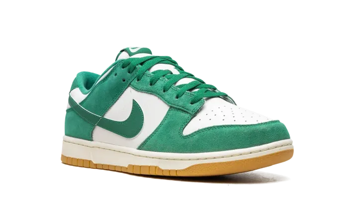 The Nike Dunk Low SE 'Malachite Gum' combines a chalk white leather base with green suede overlays at the forefoot and heel.
