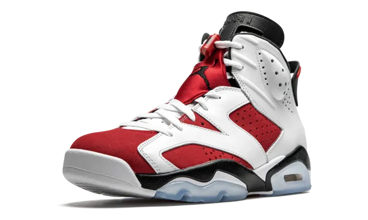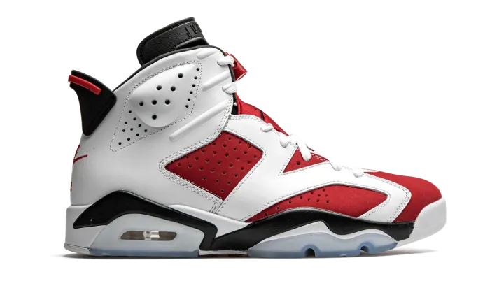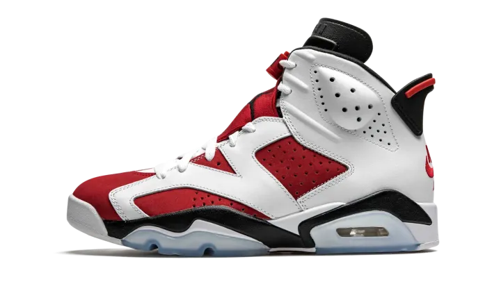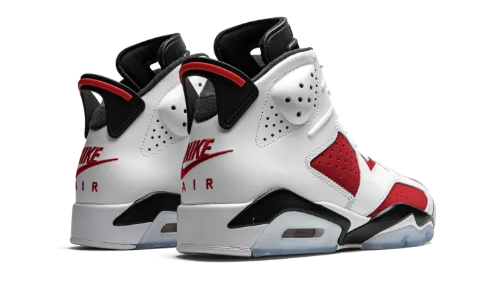 The Air Jordan 6 "Carmine 2021" is an original colorway of Michael Jordan's sixth signature shoe that was re-released by Jordan Brand in 2021. This version of the "Carmine" brings back the original "Nike Air" branding on the back of the shoe for the first time since the colorway's debut in 1991. The return to the "OG" styling coincides with the Jordan 6's 30-year-anniversary celebration in 2021. Along with the "Nike Air" embroidery on the heel, the rest of the shoe retains the correct height and panel shapes as the inaugural release. That includes white leather overlays on the forefoot, mid-panel, and eyelets above the fiery red synthetic nubuck base. Perforations on either side of the shoe and collar are consistent with the original styling of the Air Jordan 6. A black liner and neoprene lace shroud with black Jumpman embroidery compliment the shoe's retro style. The "Nike Air" logo on the heel sits beneath a spoiler-style heel tab to complete the look. Release date: February 13, 2021.