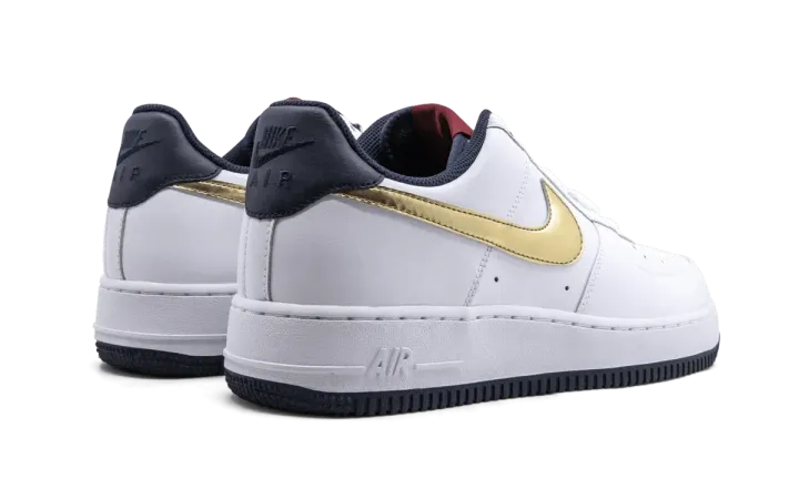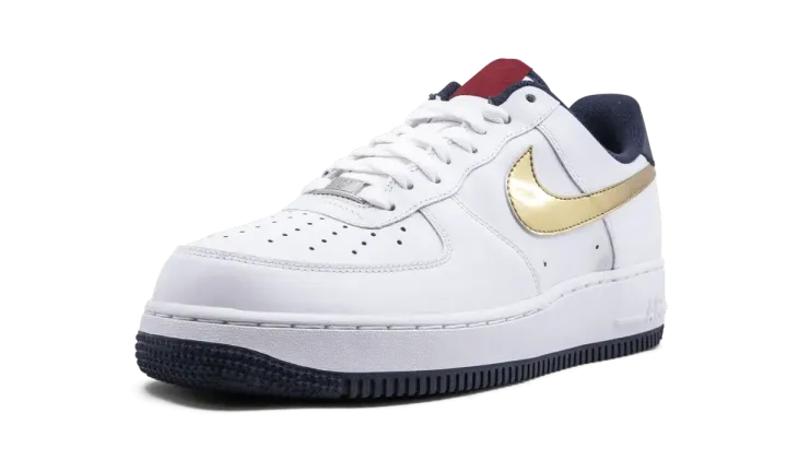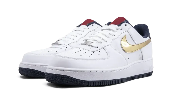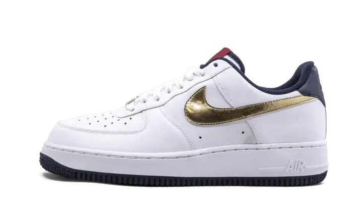 This Olympic-inspired colorway of the Nike Air Force 1 '07 originally released in 2008. The patriotic design features a white leather upper, an obsidian blue heel tab, and a red tongue tag. Obsidian blue is also used to color the cloth liner and rubber outsole. As a nod to the top prize at the Olympic games, a gold medal, the Swoosh is constructed of metallic gold patent leather