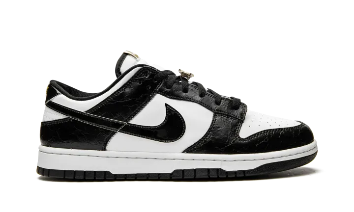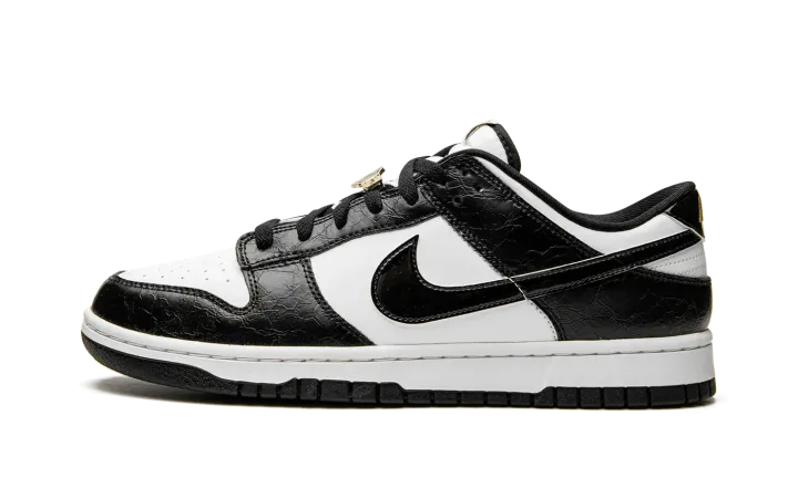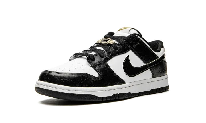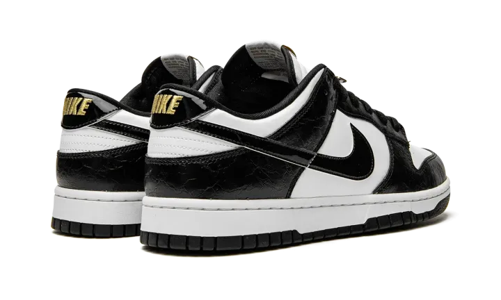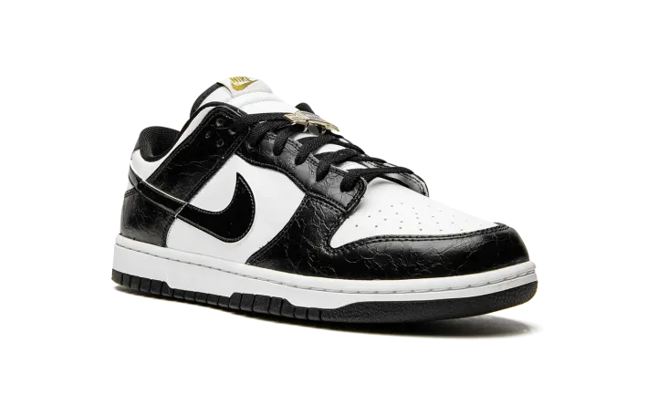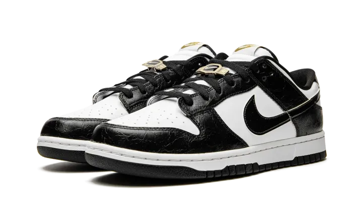 The Nike Dunk Low "World Champ" is a two-tone, white-and-black colorway inspired by professional wrestling. Releasing alongside the Dunk High "World Champ" colorway, the low-top version of the retro basketball shoe features the same "Panda" or "White/Black" inspired color block, but with a twist. A gold lace dubrae shaped in the design of a wrestling championship belt appears on the laces. Additional gold accents come into play on the "Nike" and Swoosh logos on the black nylon tongue tag. The shoe's base is designed in white leather while the overlays and Swoosh appear in textured black leather. Release date: September 17, 2022
