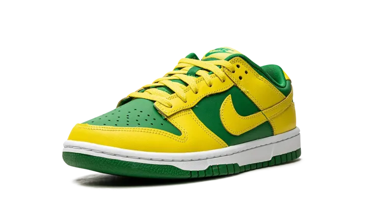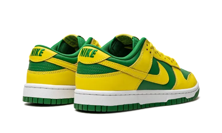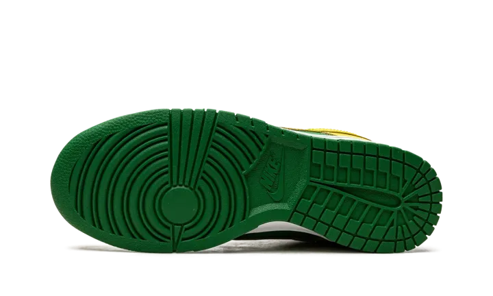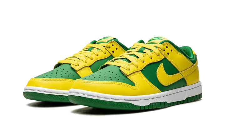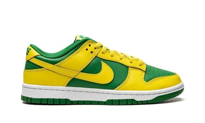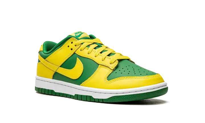 The Nike Dunk Low "Reverse Brazil" is a two-tone, yellow-and-green colorway of the retro basketball shoe that flips the color scheme of the model's popular "Brazil" style. As its name suggests, the "Reverse Brazil" reverses the color coordination of the "Brazil" Dunk, and it doesn't miss the mark. The shoe features Yellow Strike leather overlays and Swoosh branding on an Apple Green-colored leather base. A green "Nike" logo is embroidered on the yellow leather heel tab. Classic "Nike" detailing can be found on the tongue. A white rubber midsole and green outsole complete the look. Release date: February 15, 2023