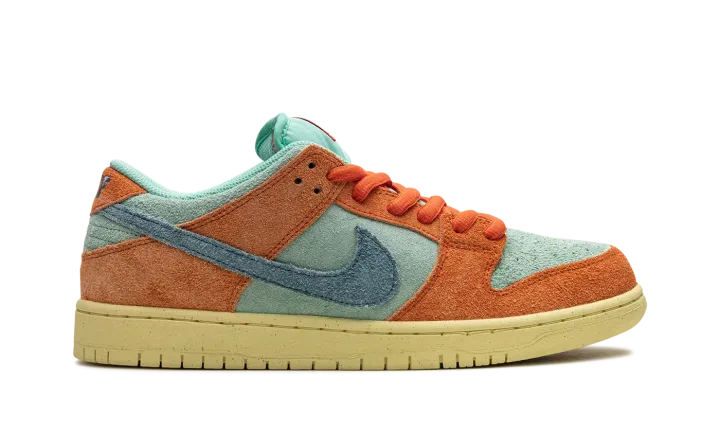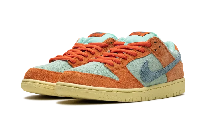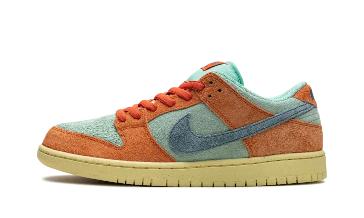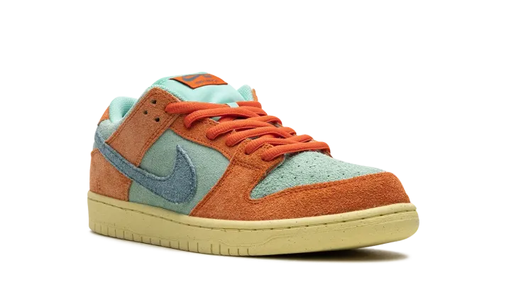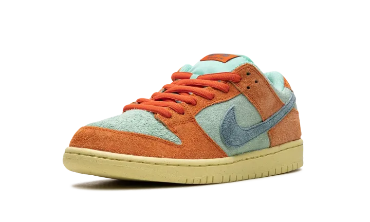The Nike SB Dunk Low "Orange/Noise Aqua" is another head-turning colorway of the classic skate shoe. Released by Nike SB in Fall 2023, the "Orange/Noise Aqua" SB Dunk Low updates the model with an all-suede look in eye-catching orange and blue hues. Orange suede overlays contrast with the Noise Aqua suede base. A blue suede Swoosh is seen on the mid-panel while classic "Nike" branding appears on the heel. A "Nike SB Dunk" logo is located on the tongue tag. An aged rubber sole completes the look.
