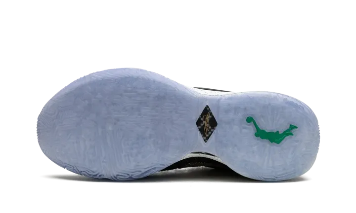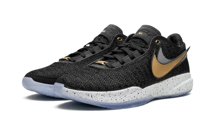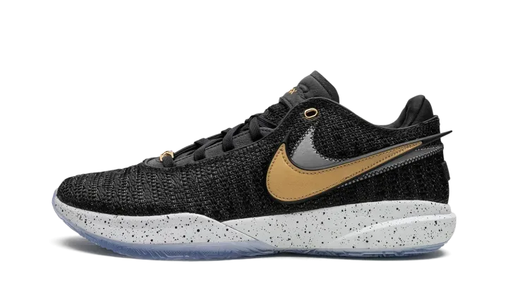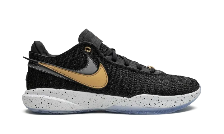 The Nike LeBron 20 "Black/Metallic Gold" is a luxurious colorway of LeBron James's twentieth signature performance basketball shoe with gold accenting. The "Black/Metallic Gold" Nike LeBron 20 features a black woven upper contrasted with a Metallic Gold Swoosh layered over a grey Swoosh on the sides. Special "XX" branding appears on the gold lace dubrae. The speckled midsole is complete with an Air Zoom Turbo cushioning pod in the forefoot and a Zoom Air cushioning unit in the heel. Release date: April 6, 2023