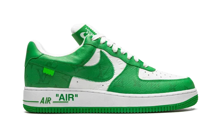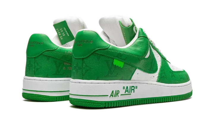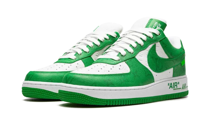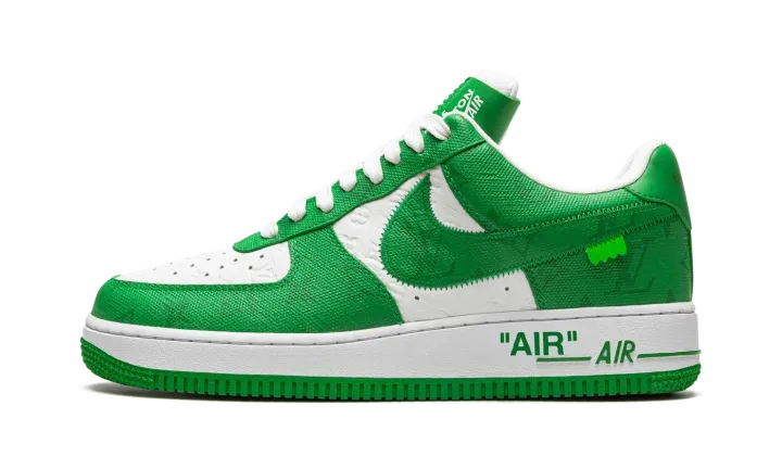 The Louis Vuitton x Nike Air Force 1 Low "White/Green" is a special collaboration between the storied high fashion house and Nike that was directed by the late Virgil Abloh. Produced by Louis Vuitton, Nike, and Abloh in 2022, the "White/Green" features a two-tone color block of white and green that replicates the color block of original Nike Dunk colorways from 1985. This highly sought after collaboration for the Air Force 1 features a white leather base with Louis Vuitton's famous monogram print stamped into the material. A contrasting green textile with the Parisian fashion brand's aforementioned pattern is found on the overlays and Swoosh. Signature details from Abloh's previous collaborations with Nike under his Off-White clothing brand include a lime green hang tag on the sides, and printed "AIR" branding alongside classic Air Force 1 "AIR" detailing on the lateral side of the midsole.