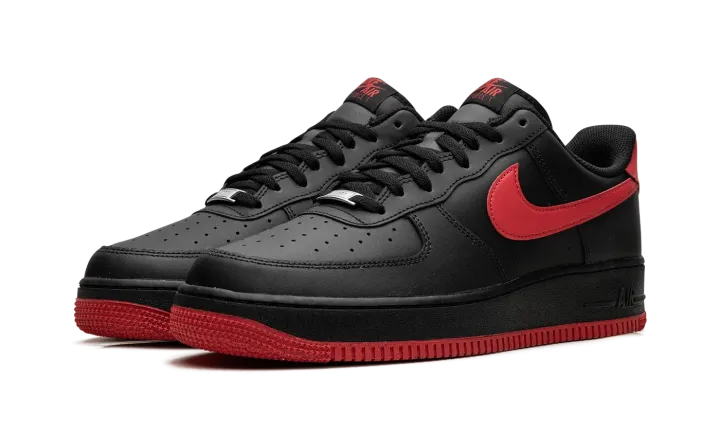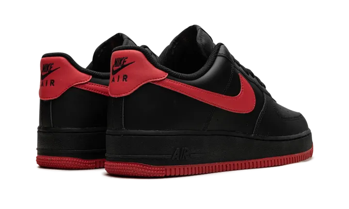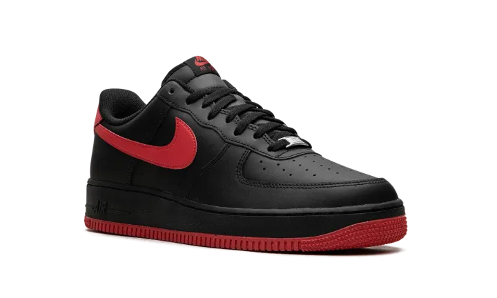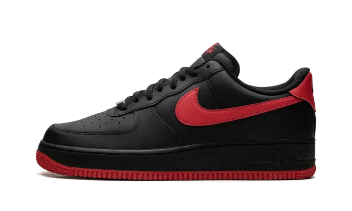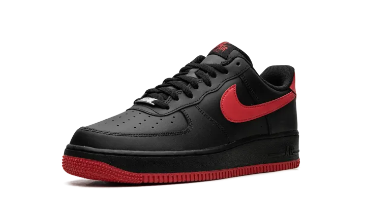 The Vamps Air Force 1 Low '07 LV8 by Nike features a black-suede upper paired with contrasting deep red on the sole, heel, and side Swoosh. The low-top design incorporates perforations on the toe box for breathability and a padded collar for comfort. On the side of the heel of the midsole, there's a raised "Air" logo in black. The durable rubber outsole and heritage-inspired design are a nod to Nike's rich basketball history.