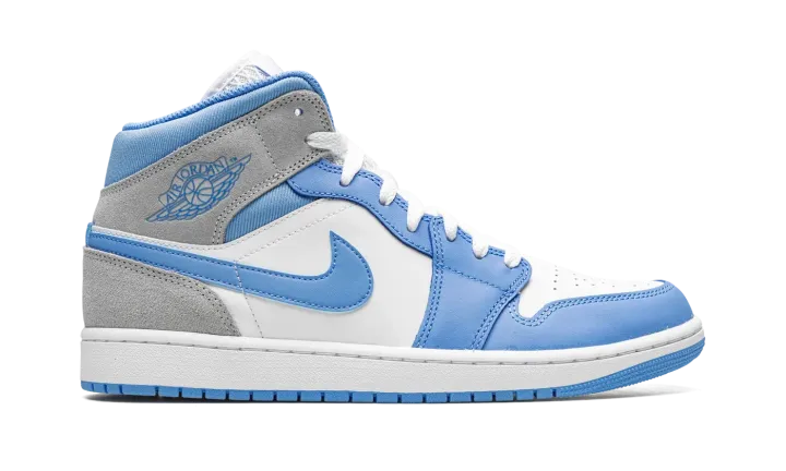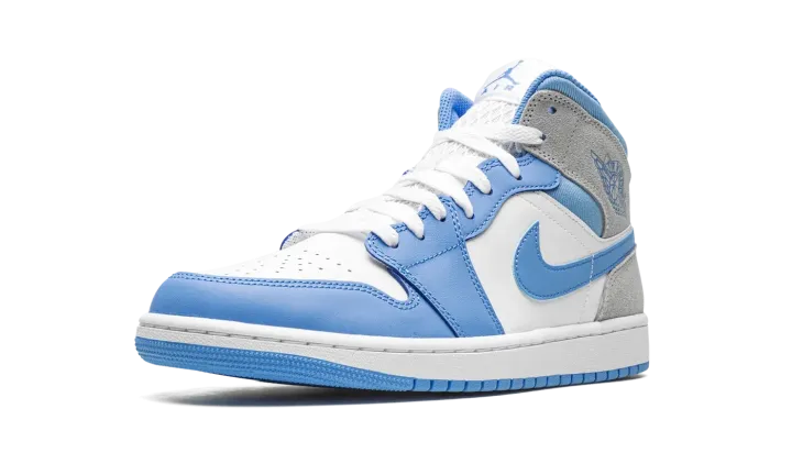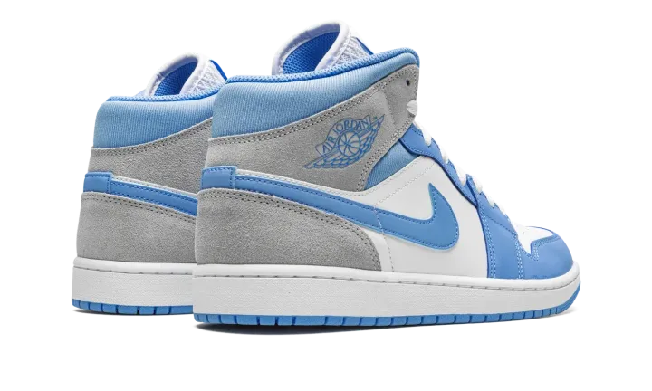The Air Jordan 1 Mid SE "University Blue/Grey" is a colorway of the lifestyle shoe with a "UNC" inspired appearance. In no way affiliated with the University of North Carolina, the "University Blue/Grey" nonetheless shows appreciation for the school with its use of the school's sports team's uniform colors on its design. The shoe is complete with a white leather base with University Blue leather overlays and Swoosh branding. Grey suede can be found on the collar and heel. A classic "Wings" logo resides on the aforementioned ankle collar panel. University Blue Jumpman and "Air" logos appear on the tongue tag on the white mesh tongue.