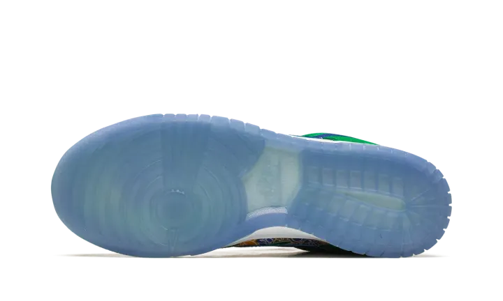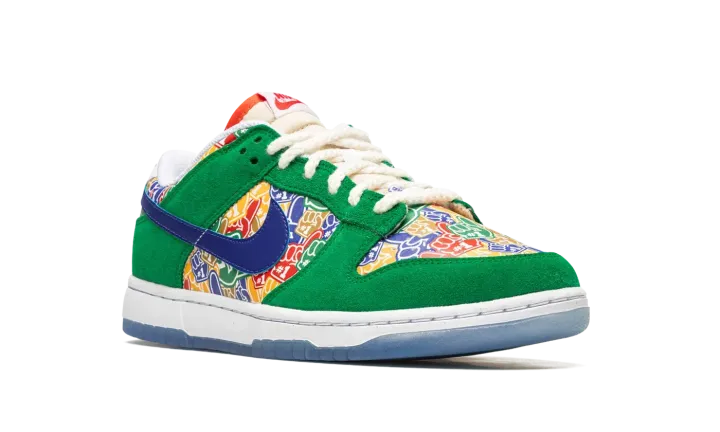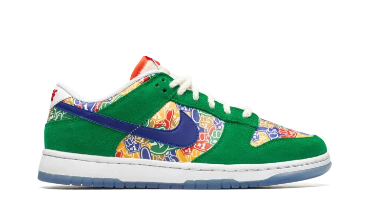 The Nike Dunk Low "Foam Finger" is a colorful look for the classic sneaker that celebrates sports fans. Inspired by the "number one" foam fingers that fans bring to sporting events around the world in support of their favorite teams, the "Foam Finger" Dunk Low features an assortment of colorful foam finger graphics on the toe, mid-panel, collar, and heel. Contrasting green suede overlays and a blue leather Swoosh contrast the look. The "Nike" branding embroidered on the heel appears in red lettering. As does the "Nike" logo on the tongue. Hemp laces, a white rubber midsole, and icy blue translucent outsole complete the look. Release date: November 8, 2022