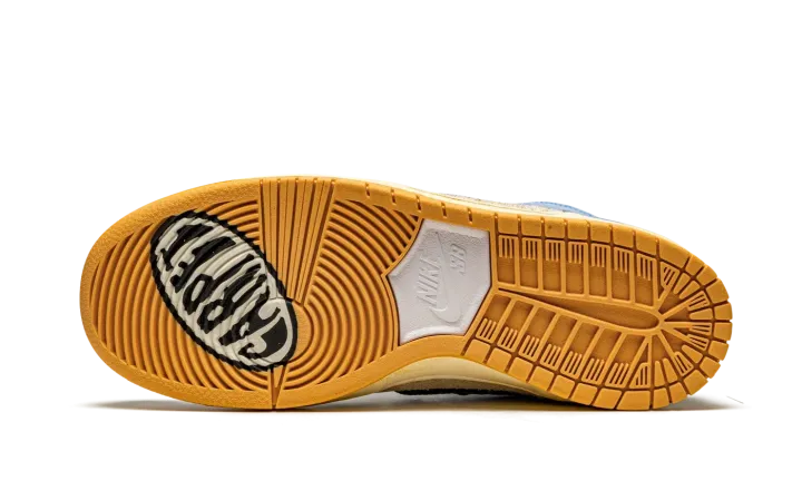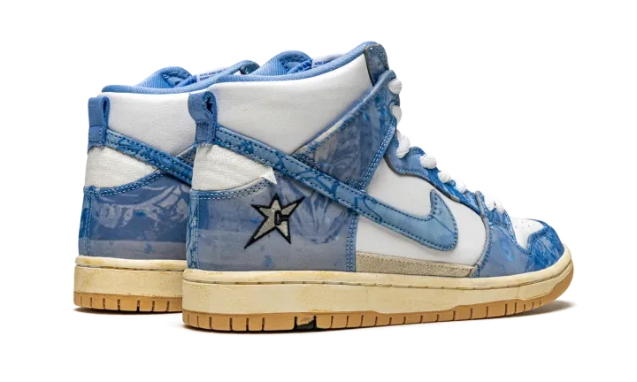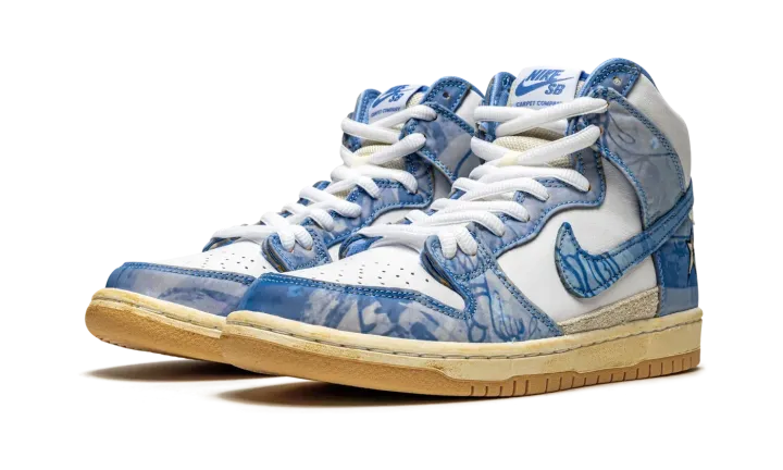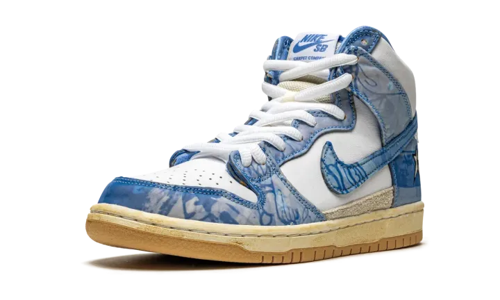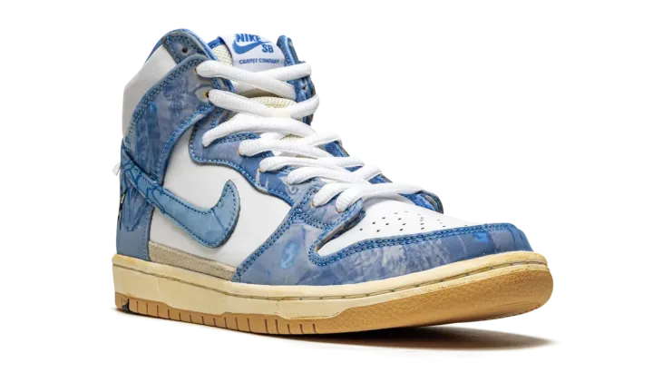 The Carpet Company x Nike SB Dunk High is a funky collaboration between the Baltimore based skateboard brand and Nike SB on the beloved skate shoe. In 2020, the Nike SB Dunk and standard Dunk recaptured their former glory and standing as some of the most playful and highly sought after shoes in Nike's footwear collection. Due in no small part to the release of too-many-to name collaborations and returning "OG" colorways, both the skate-ready SB Dunk and lifestyle Dunk were the "it" shoes of the year. The momentum carried over in a big way in 2021 thanks to models like this Carpet Company design. White-and-blue bleached graphic overlays on the forefoot, eyelets, collar, heel, and Swoosh logo garner attention against the stark white leather base. The blue material can also be worn away or cut off to reveal another colorful graphic underneath. Carpet Company embroiders its "C" star motif on the heel and a small tan suede overlay appears on the bottom of the mid-panel above the intentionally-aged yellow midsole. A co-branded tongue tag is stitched on top of the white mesh tongue and the gum rubber outsole provides plenty in the way of grip for skateboarding. Release date: March 12, 2021.