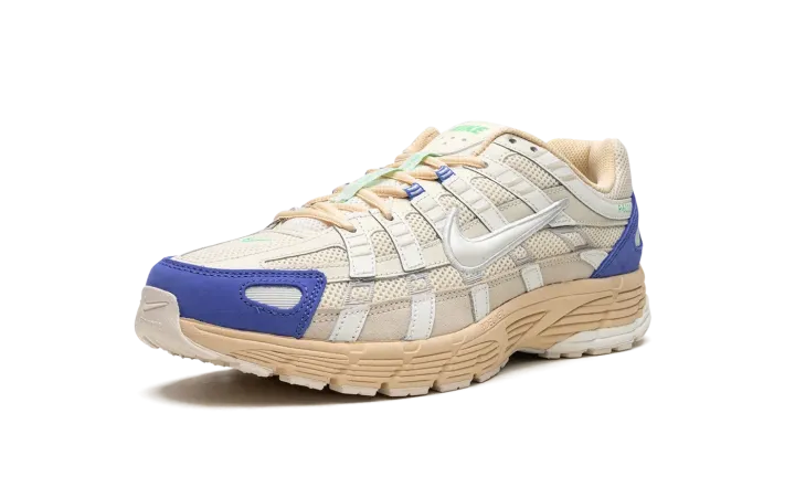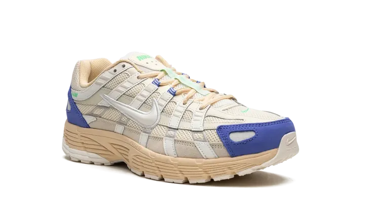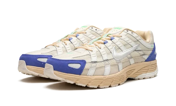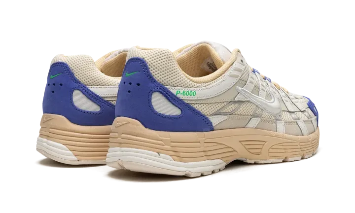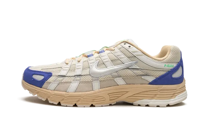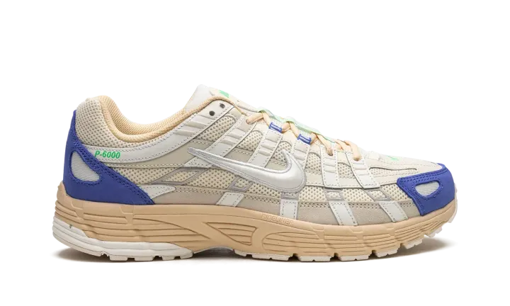 The Nike P-6000 "Athletic Department" is a special colorway of the shoe that combines style elements from the Nike Pegasus 25 and 2006. Heavily inspired by the 2000s era of running shoes, the Nike P-6000 has a retro yet modern appearance that lends itself to casual wear in today's sneaker landscape. The shoe's design features a cream mesh base with tonal and white leather overlays. A white Swoosh logo is located on either side of the shoe. Blue detailing appears on the toe overlay and green accenting is found on the "Nike" logo hit and overlay on the tongue. Release date: March 1, 2023