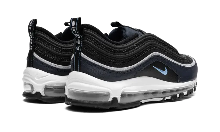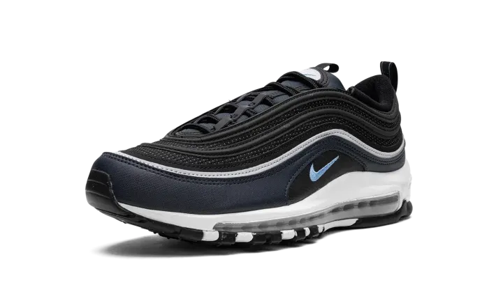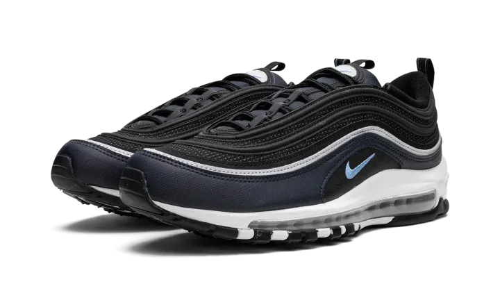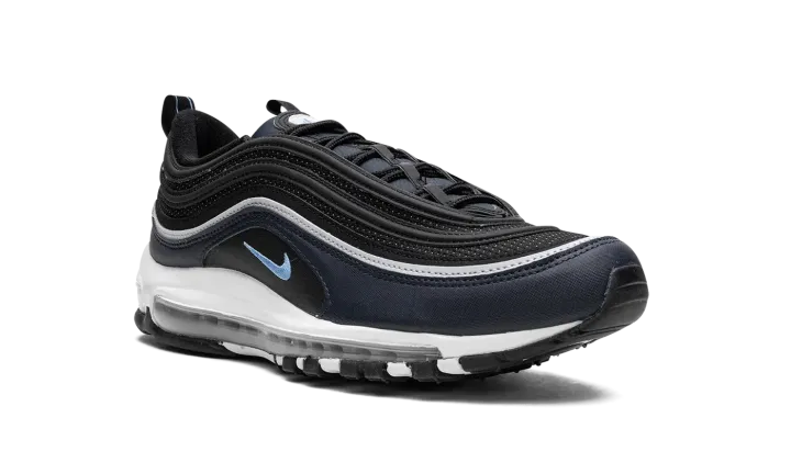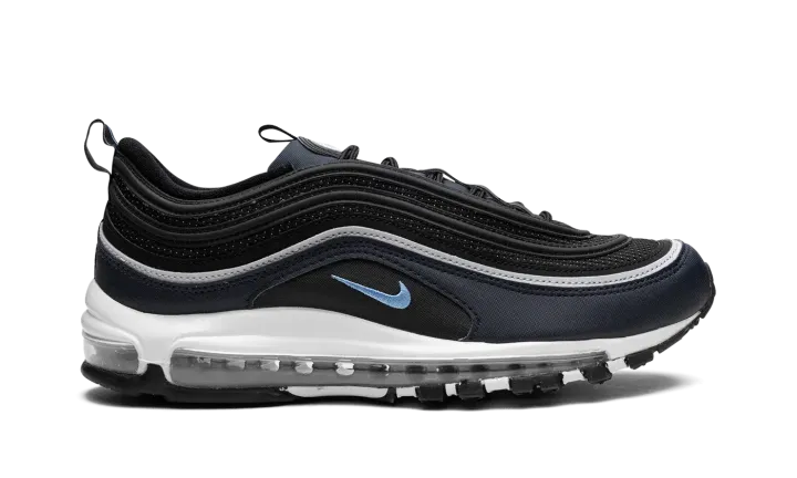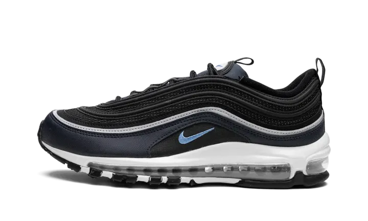 The Nike Air Max 97 "Dark Obsidian" is a colorway of the retro performance running sneaker with dark blue accents. A Spring 2023 release, the "Dark Obsidian" features a black mesh base with Dark Obsidian, or dark navy, on the mudguard. The Air Max 97's wavy overlays appear in a gradient color scheme that goes from grey to black to blue. A University Blue Swoosh is embroidered on either side. The white foam midsole features a full-length visible Max Air cushioning unit.