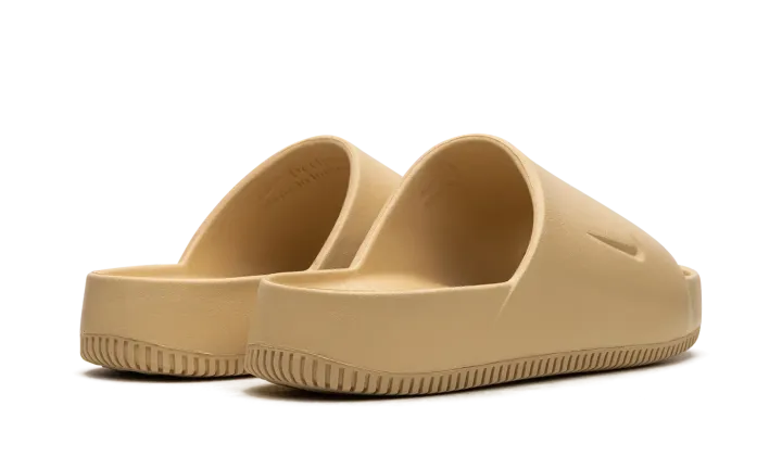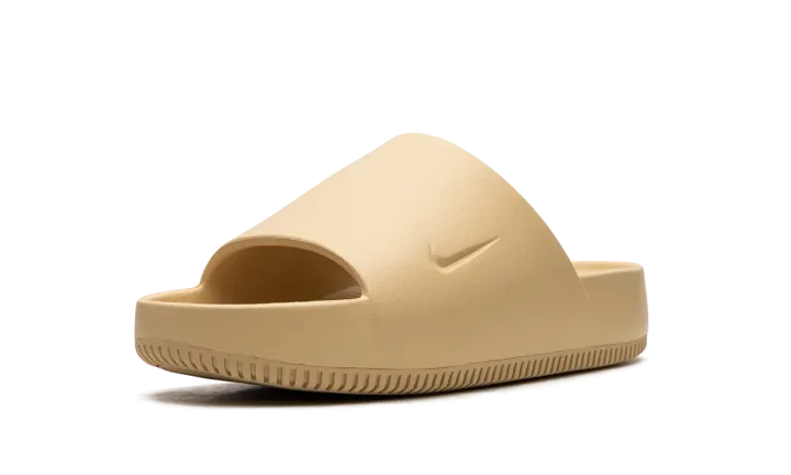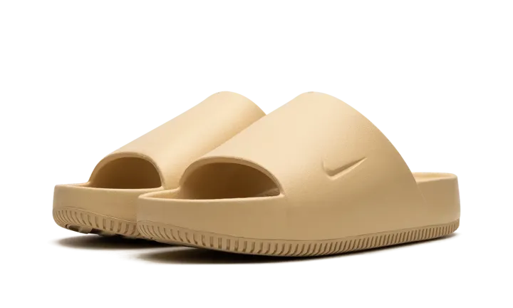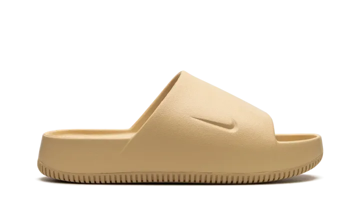 The Nike Calm Slide "Sesame" is a monochromatic tan colorway of the slip-on sandal. The Calm Slide debuted in 2023 and is a versatile footwear option for casual wear. This look for the Calm Slide is constructed from a Sesame-colored one-piece foam mold. The midfoot strap that supports the sandal features a debossed Swoosh on the side. Underneath, a thick foam cushioning footbed provides a comfortable ride.