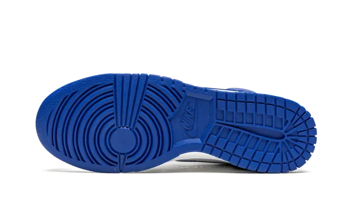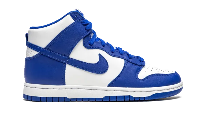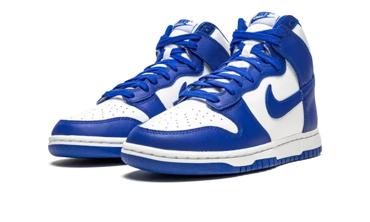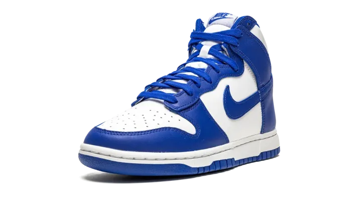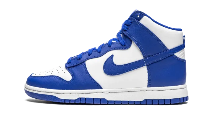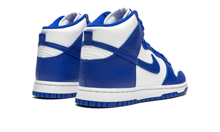White/blue leather/rubber Dunk High sneakers from NIKE featuring signature Swoosh logo detail, contrasting panel detail, round toe, perforated detailing, front lace-up fastening, ankle-length, branded insole and rubber sole. These styles are supplied by a premium sneaker marketplace. Stocking only the most sought-after footwear, they source and curate some of the most hard to find sneakers from around the world..