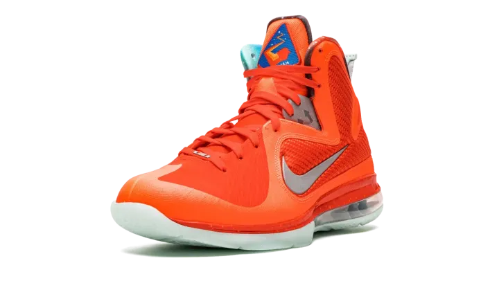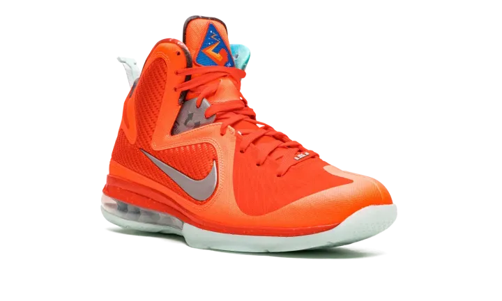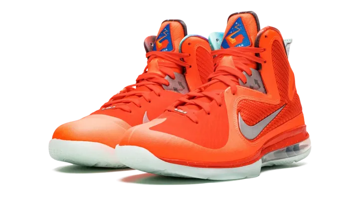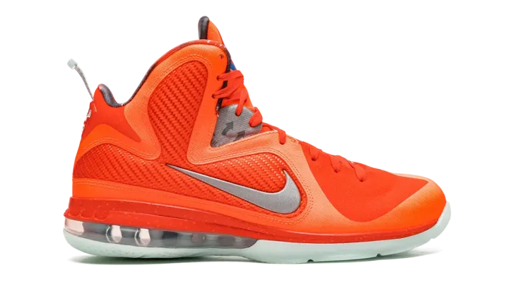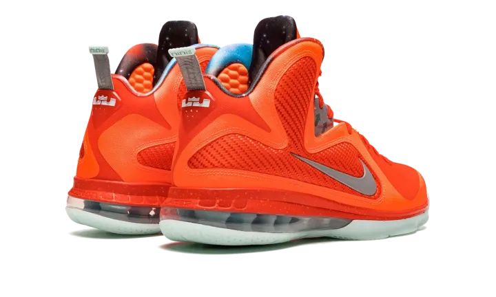 The Nike LeBron 9 "Big Bang 2022" is the February 2022 re-release of the head-turning colorway of LeBron James's ninth signature shoe that was originally released over NBA All-Star Weekend in 2012. The original "Big Bang" Nike LeBron 9 was one of multiple All-Star colorways by Nike included in the famous "Galaxy" collection that also contained the rare, ultra desirable Nike Air Foamposite One "Galaxy." Inspiration for the "Big Bang" and the "Galaxy" collection came from the Kennedy Space Center, NASA's headquarters in Florida which is located near Orlando, the site of the 2012 All-Star Game. The modern "Big Bang" is a near one-to-one remake of the original colorway. The shoe features a Total Orange mesh construction with a contrasting reflective Swoosh on the sides. The translucent glow-in-the-dark outsole sits beneath a large visible Air bubble on the heel. "Galaxy" print on the interior lining to complete the look. Release date: February 18, 2022