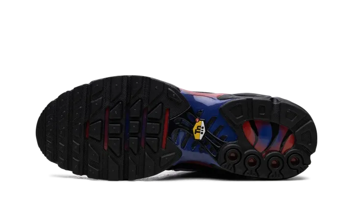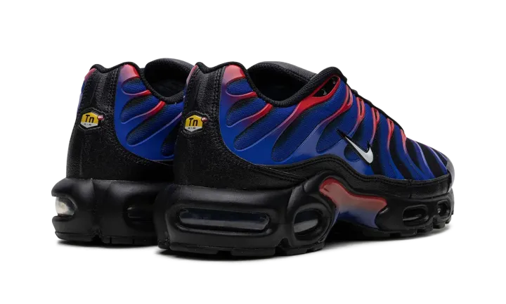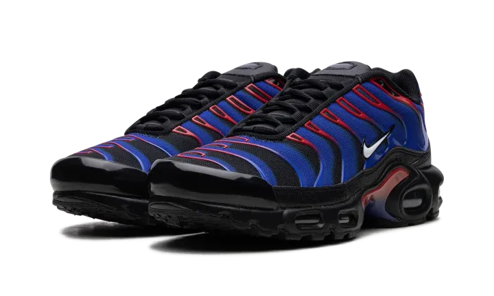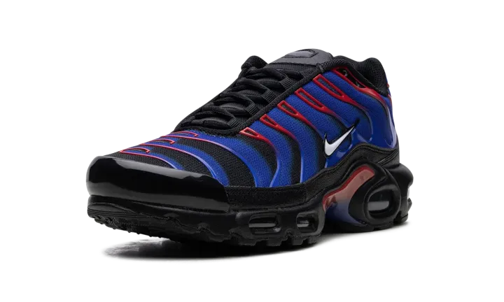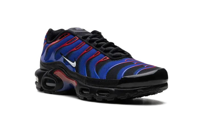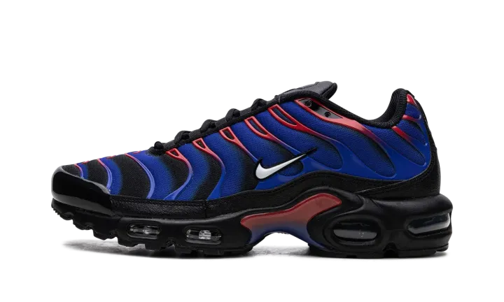 The Nike Air Max Plus "Spider-Man" is a colorway of the retro performance running shoe in a color scheme that draws comparisons to Spider-Man. While not associated with the "Spider-Man" film franchise, the "Spider-Man" colorway features the colors associated with "Spider-Man's" outfit. More specifically, the shoe has a black mesh construction with University Red and Racer Blue wavy TPU overlays. A white jeweled Swoosh is seen on the sides. The midfoot shank is designed in swirls of blue and red to complete the sneaker's "Spider-Man" inspired look. Release date: August 1, 2023