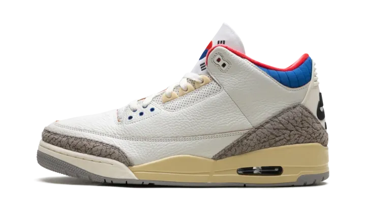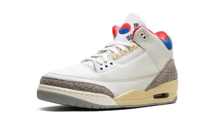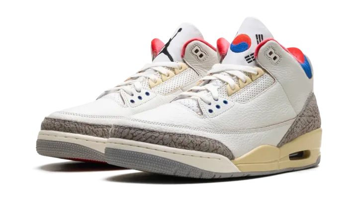 The Air Jordan 3 "Seoul 2.0" is a unique colorway of Michael Jordan's third signature shoe that honors the South Korean capital. The "Seoul 2.0" released in 2025 and followed the first "Seoul" AJ3 that came out in 2018. The "Seoul 2.0" Jordan 3 has the South Korea flag embroidered on the tongue and carries over the red and blue colors to the ankle and lining. The "Seoul 2.0" has a vintage-inspired midsole and lighter grey elephant print to distinguish it from the original.