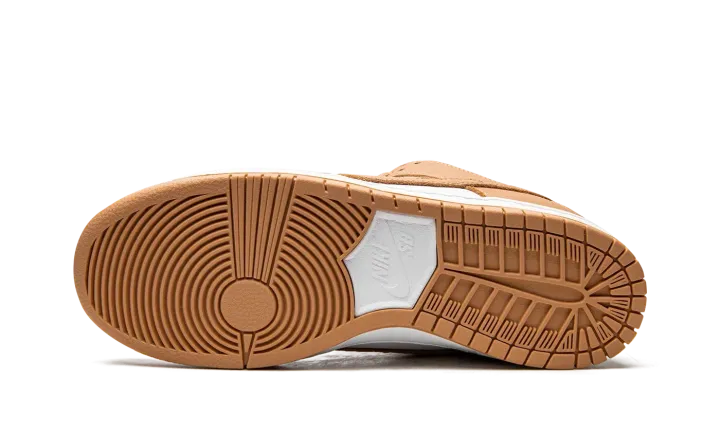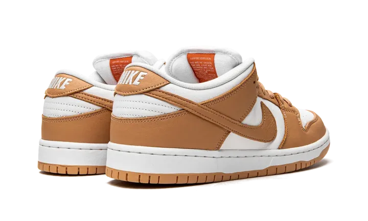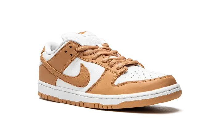 The Nike SB Dunk Low "Light Cognac" is a traditionally color-blocked take on the classic sneaker in brown tones. This colorway features a white leather base with "Light Cognac" premium leather overlays bearing a vague resemblance to the "Vachetta Tan" hues found on the AF1s last seen in 2017. The SB Dunk's traditional thick oval laces and well-padded tongue round out the upper. Below, a white midsole and light cognac rubber outsole complete the design.