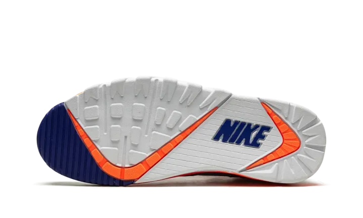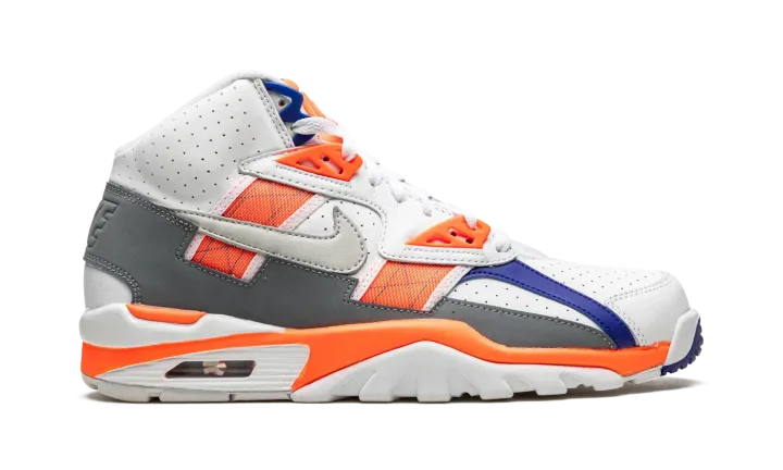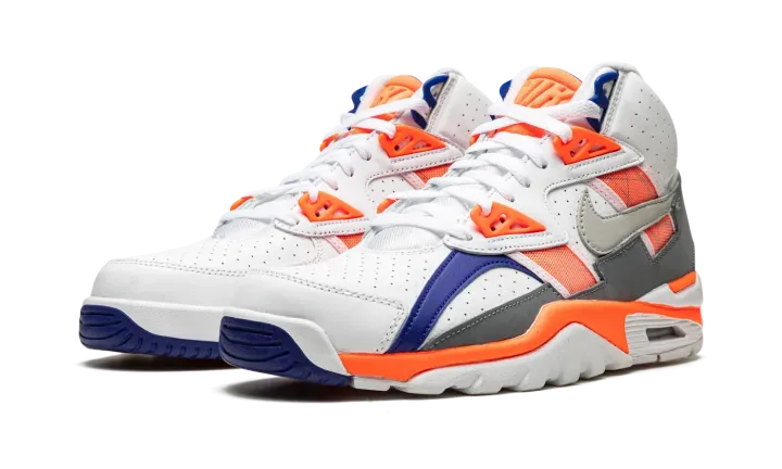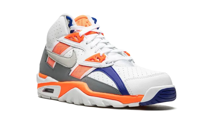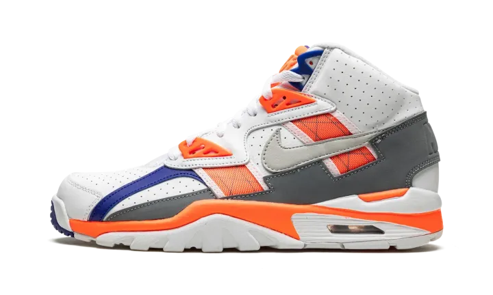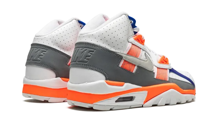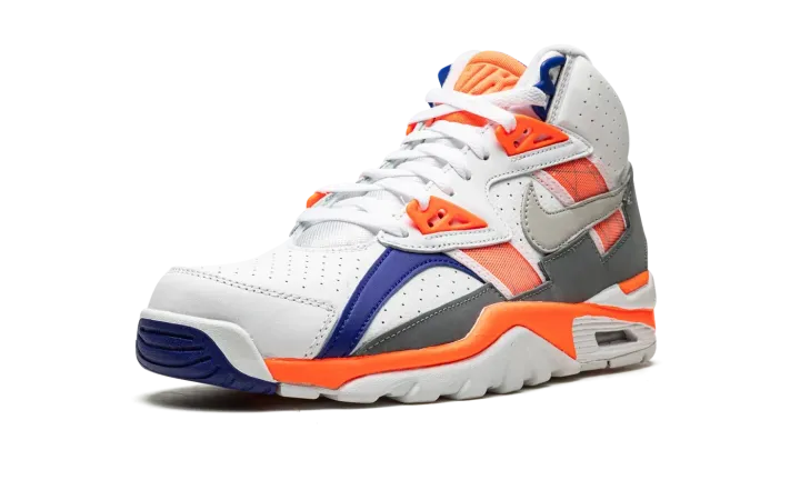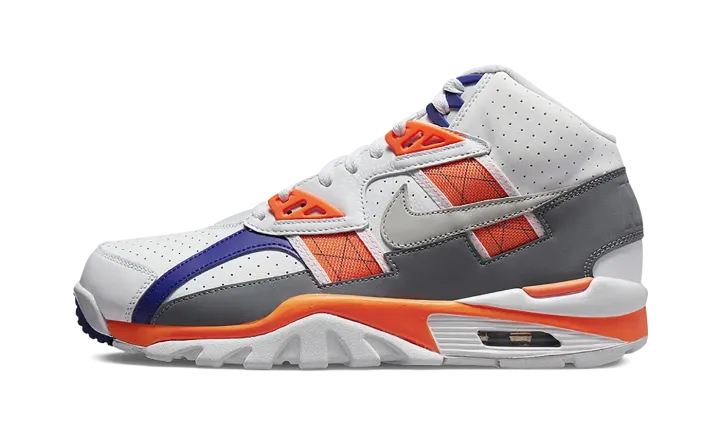 The Nike Air Trainer SC High "Auburn" is a classic colorway of Bo Jackson's former signature training shoe. Dressed in a blue, orange, and white color scheme, the "Auburn" Air Trainer SC High honors Bo's alma mater, Auburn University, where he starred on the school's football team from 1982 to 1985. Bo famously wore the performance shoe in memorable Nike advertisements in the early 1990s. The modern "Auburn" stays true to the original's design, as it features a perforated white leather upper with a blue leather overlay on the forefoot. Orange nylon straps with contrast criss-cross blue stitching anchor the eyelet panel. A grey synthetic material appears on the mudguard. A light grey felt Swoosh is found on both sides of the shoe, and debossed "NIKE" detailing appears on the heel counter. An orange overlay appears above the visible Air unit in the heel of the midsole.