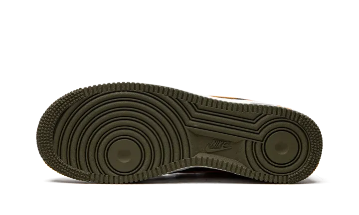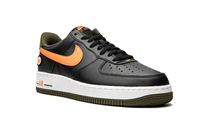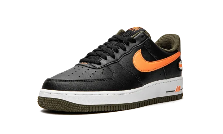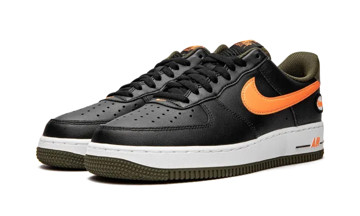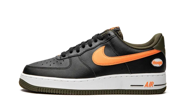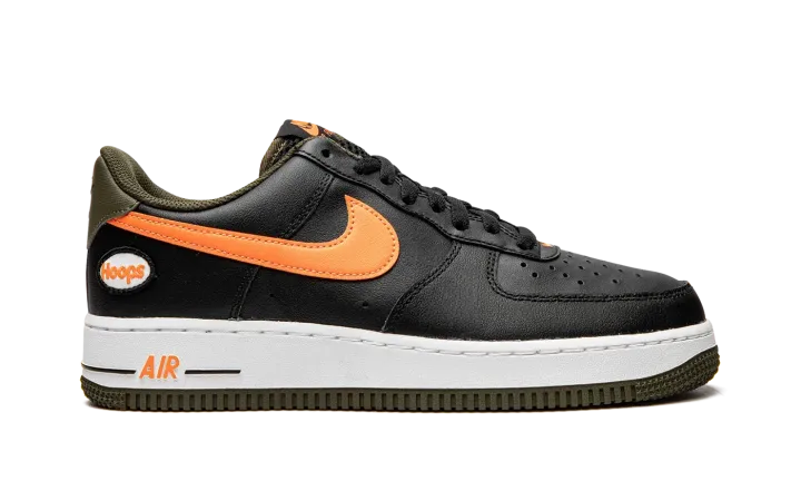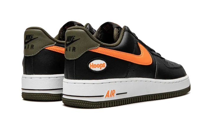 The Nike Air Force 1 Low "Hoops - Black/Orange" is a colorway of the classic basketball shoe that celebrates its legacy in the sport. This March 2022 release of the Air Force 1 features a black leather upper that's contrasted on the sides by a blazing orange leather Swoosh. The word "Hoops" appears within a small circle on the lateral side of the heel. A black "Nike Air" logo is paired with a black Swoosh on the olive green heel tab. Traditional "Nike Air Force 1" branding is printed in orange text on the black mesh tongue. Underfoot, orange "Air" detailing appears on the lateral side of the white rubber midsole. The shoe rides on an olive green outsole. Release date: March 21, 2022